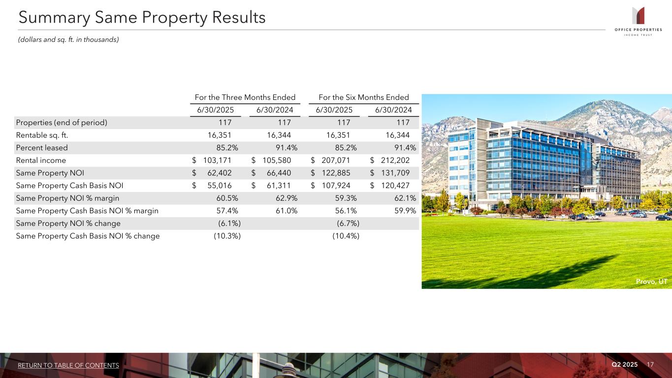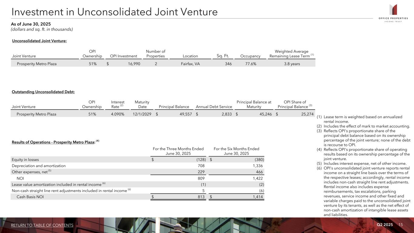 Q2 2025 15RETURN TO TABLE OF CONTENTS Unconsolidated Joint Venture: Joint Venture OPI Ownership OPI Investment Number of Properties Location Sq. Ft. Occupancy Weighted Average Remaining Lease Term (1) Prosperity Metro Plaza 51% $ 16,990 2 Fairfax, VA 346 77.6% 3.8 years (1) Lease term is weighted based on annualized rental income. (2) Includes the effect of mark to market accounting. (3) Reflects OPI's proportionate share of the principal debt balance based on its ownership percentage of the joint venture; none of the debt is recourse to OPI. (4) Reflects OPI's proportionate share of operating results based on its ownership percentage of the joint venture. (5) Includes interest expense, net of other income. (6) OPI's unconsolidated joint venture reports rental income on a straight line basis over the terms of the respective leases; accordingly, rental income includes non-cash straight line rent adjustments. Rental income also includes expense reimbursements, tax escalations, parking revenues, service income and other fixed and variable charges paid to the unconsolidated joint venture by its tenants, as well as the net effect of non-cash amortization of intangible lease assets and liabilities. Investment in Unconsolidated Joint Venture As of June 30, 2025 (dollars and sq. ft. in thousands) Results of Operations - Prosperity Metro Plaza: (4) For the Three Months Ended June 30, 2025 For the Six Months Ended June 30, 2025 Equity in losses $ (128) $ (380) Depreciation and amortization 708 1,336 Other expenses, net (5) 229 466 NOI 809 1,422 Lease value amortization included in rental income (6) (1) (2) Non-cash straight line rent adjustments included in rental income (6) 5 (6) Cash Basis NOI $ 813 $ 1,414 Outstanding Unconsolidated Debt: Joint Venture OPI Ownership Interest Rate (2) Maturity Date Principal Balance Annual Debt Service Principal Balance at Maturity OPI Share of Principal Balance (3) Prosperity Metro Plaza 51% 4.090% 12/1/2029 $ 49,557 $ 2,833 $ 45,246 $ 25,274
