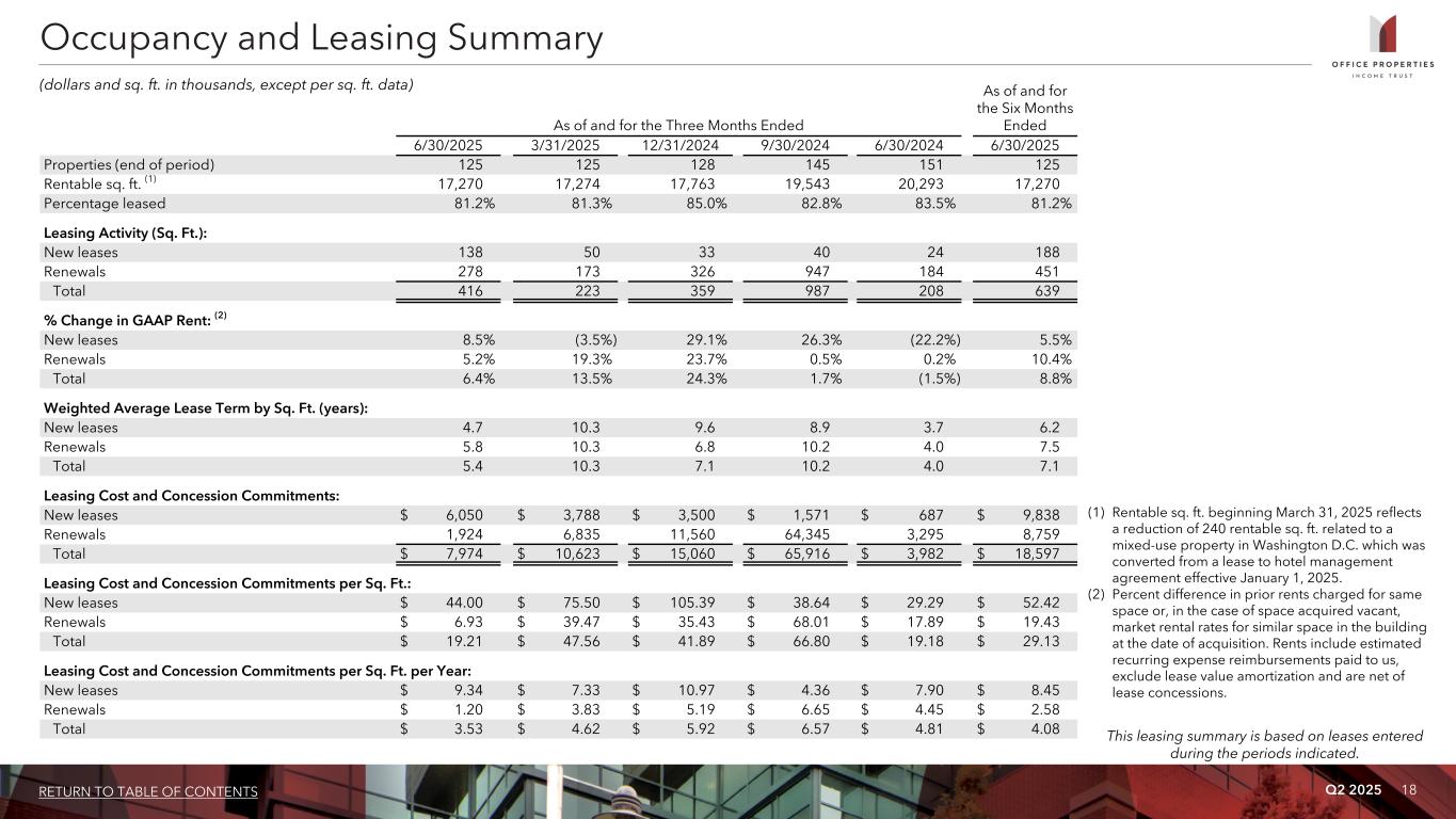 Q2 2025 17RETURN TO TABLE OF CONTENTS For the Three Months Ended For the Six Months Ended 6/30/2025 6/30/2024 6/30/2025 6/30/2024 Properties (end of period) 117 117 117 117 Rentable sq. ft. 16,351 16,344 16,351 16,344 Percent leased 85.2% 91.4% 85.2% 91.4% Rental income $ 103,171 $ 105,580 $ 207,071 $ 212,202 Same Property NOI $ 62,402 $ 66,440 $ 122,885 $ 131,709 Same Property Cash Basis NOI $ 55,016 $ 61,311 $ 107,924 $ 120,427 Same Property NOI % margin 60.5% 62.9% 59.3% 62.1% Same Property Cash Basis NOI % margin 57.4% 61.0% 56.1% 59.9% Same Property NOI % change (6.1%) (6.7%) Same Property Cash Basis NOI % change (10.3%) (10.4%) Summary Same Property Results (dollars and sq. ft. in thousands) Provo, UT