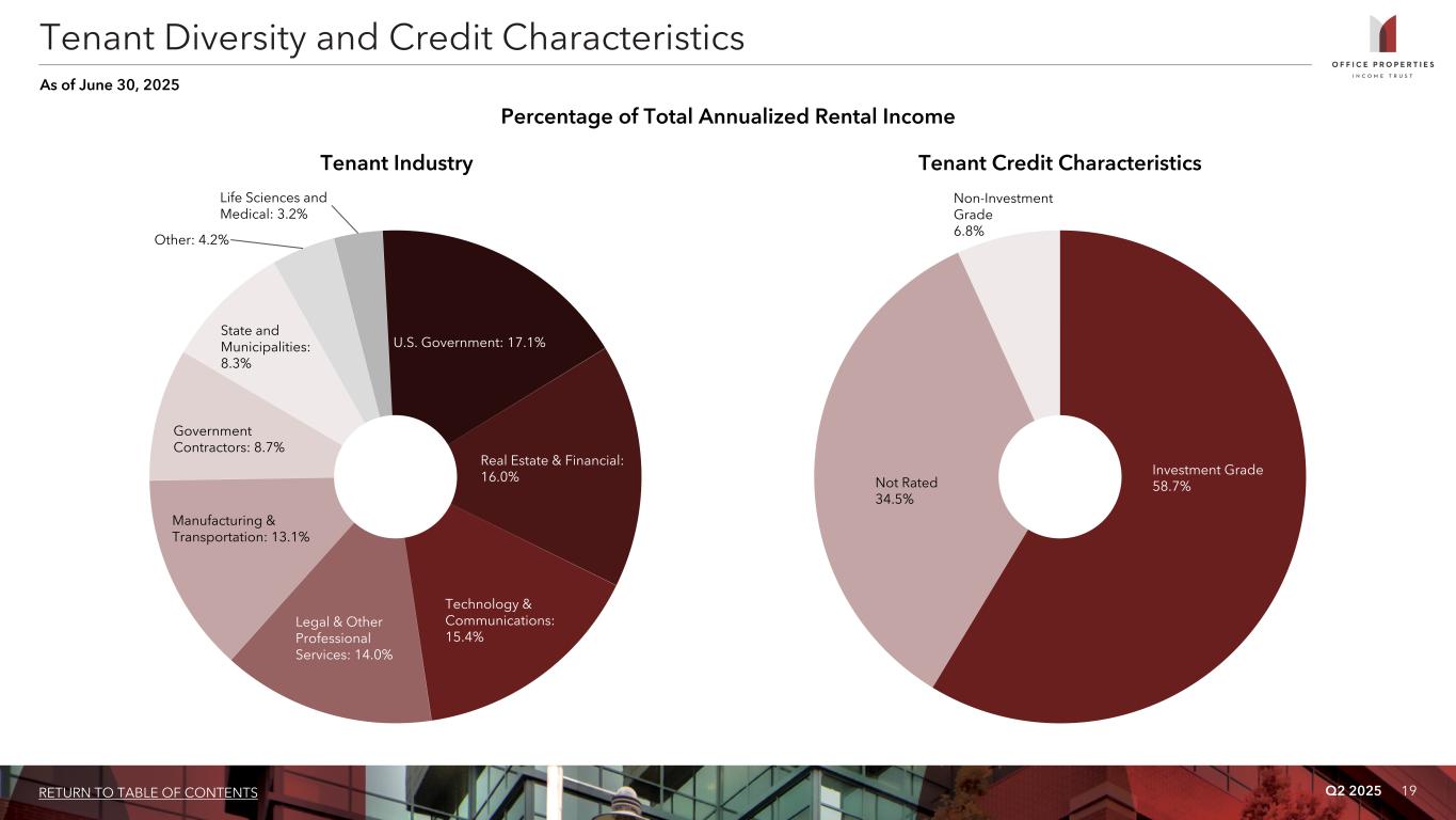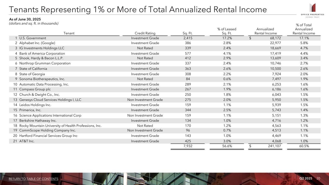 Q2 2025 19RETURN TO TABLE OF CONTENTS Investment Grade 58.7%Not Rated 34.5% Non-Investment Grade 6.8% Percentage of Total Annualized Rental Income Tenant Credit Characteristics ( 4 ) (3) Tenant Industry Tenant Diversity and Credit Characteristics As of June 30, 2025 U.S. Government: 17.1% Real Estate & Financial: 16.0% Technology & Communications: 15.4% Legal & Other Professional Services: 14.0% Manufacturing & Transportation: 13.1% Government Contractors: 8.7% State and Municipalities: 8.3% Other: 4.2% Life Sciences and Medical: 3.2%