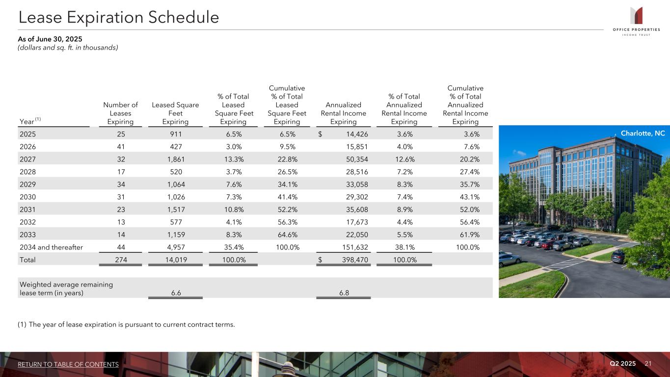 Q2 2025 20RETURN TO TABLE OF CONTENTS Tenant Credit Rating Sq. Ft. % of Leased Sq. Ft. Annualized Rental Income % of Total Annualized Rental Income 1 U.S. Government Investment Grade 2,415 17.2% $ 68,172 17.1% 2 Alphabet Inc. (Google) Investment Grade 386 2.8% 22,977 5.8% 3 IG Investments Holdings LLC Not Rated 339 2.4% 18,669 4.7% 4 Bank of America Corporation Investment Grade 577 4.1% 17,419 4.4% 5 Shook, Hardy & Bacon L.L.P. Not Rated 412 2.9% 13,609 3.4% 6 Northrop Grumman Corporation Investment Grade 337 2.4% 10,746 2.7% 7 State of California Investment Grade 363 2.6% 10,500 2.6% 8 State of Georgia Investment Grade 308 2.2% 7,924 2.0% 9 Sonoma Biotherapeutics, Inc. Not Rated 84 0.6% 7,497 1.9% 10 Automatic Data Processing, Inc. Investment Grade 289 2.1% 6,253 1.6% 11 Compass Group plc Investment Grade 267 1.9% 6,186 1.6% 12 Church & Dwight Co., Inc. Investment Grade 250 1.8% 6,043 1.5% 13 Genesys Cloud Services Holdings I, LLC Non Investment Grade 275 2.0% 5,950 1.5% 14 Leidos Holdings Inc. Investment Grade 159 1.1% 5,939 1.5% 15 Primerica, Inc. Investment Grade 344 2.5% 5,743 1.4% 16 Science Applications International Corp Non Investment Grade 159 1.1% 5,151 1.3% 17 Berkshire Hathaway Inc. Investment Grade 134 1.0% 4,716 1.2% 18 Rocky Mountain University of Health Professions, Inc. Not Rated 170 1.2% 4,563 1.1% 19 CommScope Holding Company Inc. Non Investment Grade 96 0.7% 4,513 1.1% 20 Hartford Financial Services Group Inc Investment Grade 143 1.0% 4,469 1.1% 21 AT&T Inc. Investment Grade 425 3.0% 4,068 1.0% 7,932 56.6% $ 241,107 60.5% Tenants Representing 1% or More of Total Annualized Rental Income As of June 30, 2025 (dollars and sq. ft. in thousands)