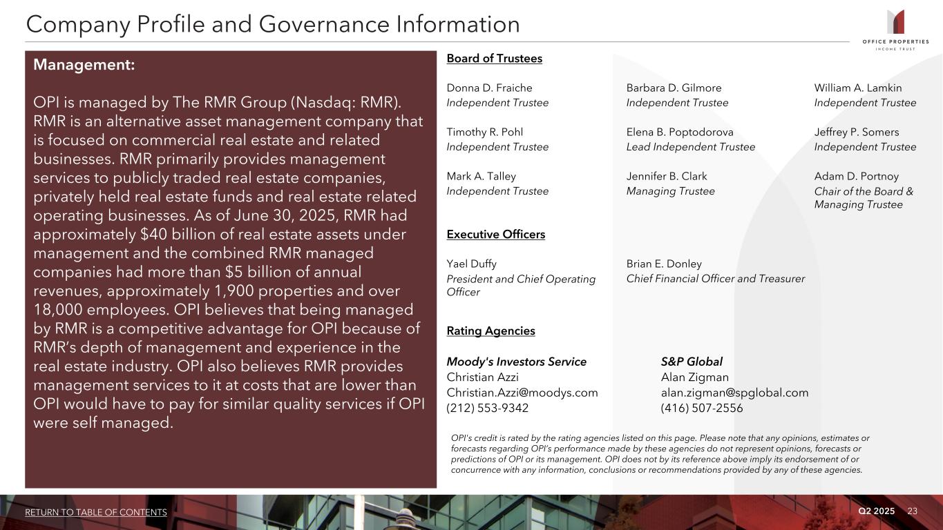 23RETURN TO TABLE OF CONTENTS Q2 2025 Management: OPI is managed by The RMR Group (Nasdaq: RMR). RMR is an alternative asset management company that is focused on commercial real estate and related businesses. RMR primarily provides management services to publicly traded real estate companies, privately held real estate funds and real estate related operating businesses. As of June 30, 2025, RMR had approximately $40 billion of real estate assets under management and the combined RMR managed companies had more than $5 billion of annual revenues, approximately 1,900 properties and over 18,000 employees. OPI believes that being managed by RMR is a competitive advantage for OPI because of RMR’s depth of management and experience in the real estate industry. OPI also believes RMR provides management services to it at costs that are lower than OPI would have to pay for similar quality services if OPI were self managed. Company Profile and Governance Information Rating Agencies Moody's Investors Service S&P Global Christian Azzi Alan Zigman Christian.Azzi@moodys.com alan.zigman@spglobal.com (212) 553-9342 (416) 507-2556 OPI's credit is rated by the rating agencies listed on this page. Please note that any opinions, estimates or forecasts regarding OPI’s performance made by these agencies do not represent opinions, forecasts or predictions of OPI or its management. OPI does not by its reference above imply its endorsement of or concurrence with any information, conclusions or recommendations provided by any of these agencies. Board of Trustees Donna D. Fraiche Barbara D. Gilmore William A. Lamkin Independent Trustee Independent Trustee Independent Trustee Timothy R. Pohl Elena B. Poptodorova Jeffrey P. Somers Independent Trustee Lead Independent Trustee Independent Trustee Mark A. Talley Jennifer B. Clark Adam D. Portnoy Independent Trustee Managing Trustee Chair of the Board & Managing Trustee Executive Officers Yael Duffy Brian E. Donley President and Chief Operating Officer Chief Financial Officer and Treasurer