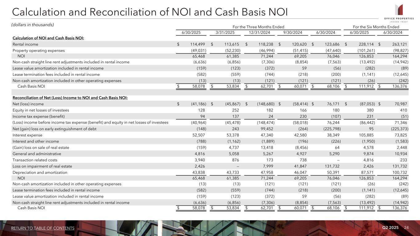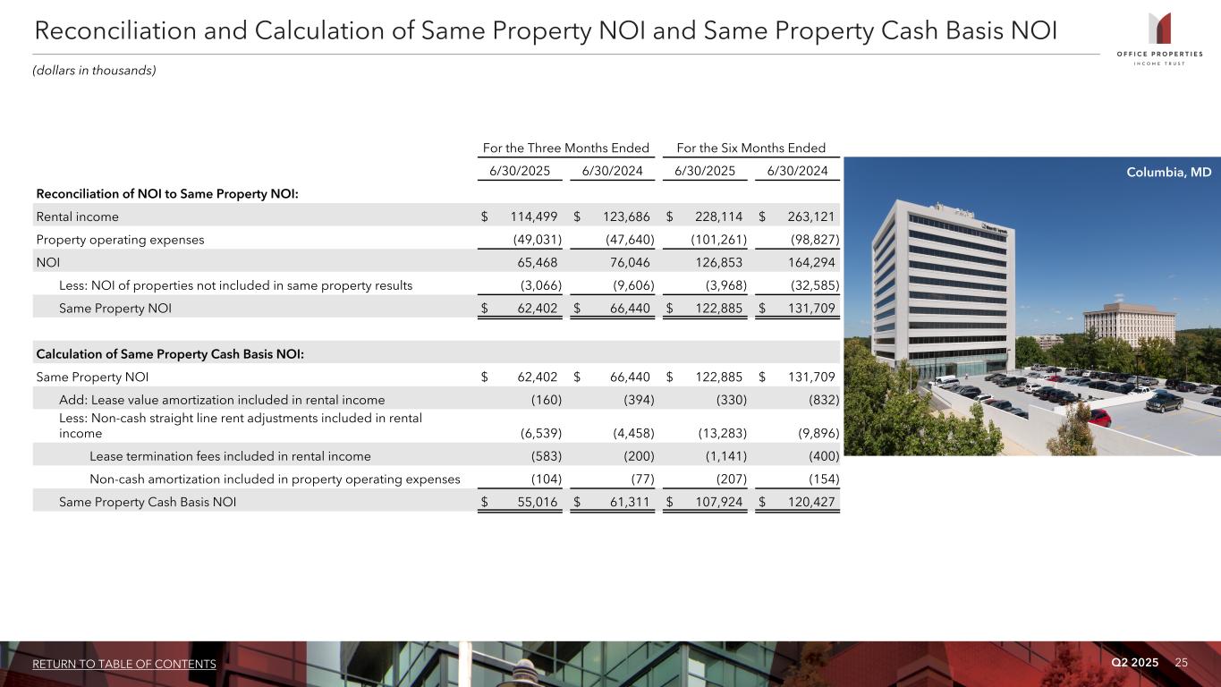 Q2 2025 24RETURN TO TABLE OF CONTENTS For the Three Months Ended For the Six Months Ended 6/30/2025 3/31/2025 12/31/2024 9/30/2024 6/30/2024 6/30/2025 6/30/2024 Calculation of NOI and Cash Basis NOI: Rental income $ 114,499 $ 113,615 $ 118,238 $ 120,620 $ 123,686 $ 228,114 $ 263,121 Property operating expenses (49,031) (52,230) (46,994) (51,415) (47,640) (101,261) (98,827) NOI 65,468 61,385 71,244 69,205 76,046 126,853 164,294 Non-cash straight line rent adjustments included in rental income (6,636) (6,856) (7,306) (8,854) (7,563) (13,492) (14,942) Lease value amortization included in rental income (159) (123) (372) 59 (56) (282) (89) Lease termination fees included in rental income (582) (559) (744) (218) (200) (1,141) (12,645) Non-cash amortization included in other operating expenses (13) (13) (121) (121) (121) (26) (242) Cash Basis NOI $ 58,078 $ 53,834 $ 62,701 $ 60,071 $ 68,106 $ 111,912 $ 136,376 Reconciliation of Net (Loss) Income to NOI and Cash Basis NOI: Net (loss) income $ (41,186) $ (45,867) $ (148,680) $ (58,414) $ 76,171 $ (87,053) $ 70,987 Equity in net losses of investees 128 252 182 166 180 380 410 Income tax expense (benefit) 94 137 24 230 (107) 231 (51) (Loss) income before income tax expense (benefit) and equity in net losses of investees (40,964) (45,478) (148,474) (58,018) 76,244 (86,442) 71,346 Net (gain) loss on early extinguishment of debt (148) 243 99,452 (264) (225,798) 95 (225,373) Interest expense 52,507 53,378 47,340 42,580 38,349 105,885 73,825 Interest and other income (788) (1,162) (1,889) (196) (226) (1,950) (1,583) (Gain) loss on sale of real estate (159) 4,737 13,418 (8,456) 64 4,578 2,448 General and administrative 4,816 5,058 5,267 4,927 5,290 9,874 10,934 Transaction related costs 3,940 876 173 738 — 4,816 233 Loss on impairment of real estate 2,426 — 7,999 41,847 131,732 2,426 131,732 Depreciation and amortization 43,838 43,733 47,958 46,047 50,391 87,571 100,732 NOI 65,468 61,385 71,244 69,205 76,046 126,853 164,294 Non-cash amortization included in other operating expenses (13) (13) (121) (121) (121) (26) (242) Lease termination fees included in rental income (582) (559) (744) (218) (200) (1,141) (12,645) Lease value amortization included in rental income (159) (123) (372) 59 (56) (282) (89) Non-cash straight line rent adjustments included in rental income (6,636) (6,856) (7,306) (8,854) (7,563) (13,492) (14,942) Cash Basis NOI $ 58,078 $ 53,834 $ 62,701 $ 60,071 $ 68,106 $ 111,912 $ 136,376 Calculation and Reconciliation of NOI and Cash Basis NOI (dollars in thousands)