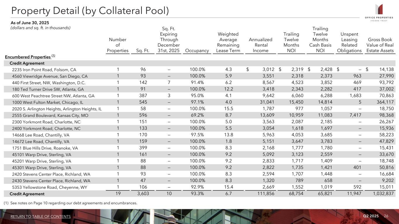 Q2 2025 25RETURN TO TABLE OF CONTENTS For the Three Months Ended For the Six Months Ended 6/30/2025 6/30/2024 6/30/2025 6/30/2024 Reconciliation of NOI to Same Property NOI: Rental income $ 114,499 $ 123,686 $ 228,114 $ 263,121 Property operating expenses (49,031) (47,640) (101,261) (98,827) NOI 65,468 76,046 126,853 164,294 Less: NOI of properties not included in same property results (3,066) (9,606) (3,968) (32,585) Same Property NOI $ 62,402 $ 66,440 $ 122,885 $ 131,709 Calculation of Same Property Cash Basis NOI: Same Property NOI $ 62,402 $ 66,440 $ 122,885 $ 131,709 Add: Lease value amortization included in rental income (160) (394) (330) (832) Less: Non-cash straight line rent adjustments included in rental income (6,539) (4,458) (13,283) (9,896) Lease termination fees included in rental income (583) (200) (1,141) (400) Non-cash amortization included in property operating expenses (104) (77) (207) (154) Same Property Cash Basis NOI $ 55,016 $ 61,311 $ 107,924 $ 120,427 Reconciliation and Calculation of Same Property NOI and Same Property Cash Basis NOI (dollars in thousands) Columbia, MD