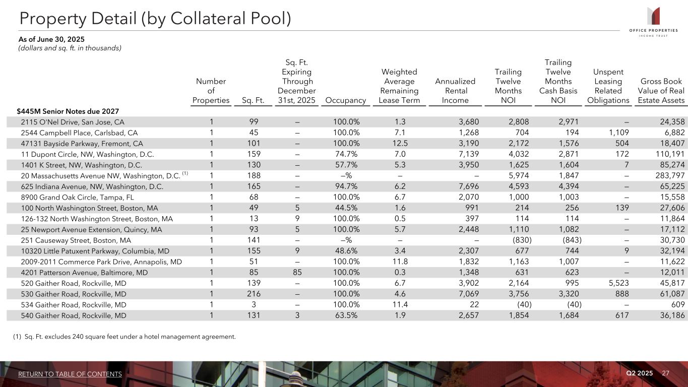 Q2 2025 26RETURN TO TABLE OF CONTENTS Property Detail (by Collateral Pool) As of June 30, 2025 (dollars and sq. ft. in thousands) Number of Properties Sq. Ft. Sq. Ft. Expiring Through December 31st, 2025 Occupancy Weighted Average Remaining Lease Term Annualized Rental Income Trailing Twelve Months NOI Trailing Twelve Months Cash Basis NOI Unspent Leasing Related Obligations Gross Book Value of Real Estate Assets Encumbered Properties (1) Credit Agreement 2235 Iron Point Road, Folsom, CA 1 96 — 100.0% 4.3 $ 3,012 $ 2,319 $ 2,428 $ — $ 14,138 4560 Viewridge Avenue, San Diego, CA 1 93 — 100.0% 5.9 3,551 2,318 2,373 963 27,990 440 First Street, NW, Washington, D.C. 1 142 7 91.4% 6.2 8,567 4,523 3,852 469 93,792 180 Ted Turner Drive SW, Atlanta, GA 1 91 — 100.0% 12.2 3,418 2,343 2,282 417 37,002 600 West Peachtree Street NW, Atlanta, GA 1 387 3 95.0% 4.1 9,642 6,060 6,288 1,683 70,863 1000 West Fulton Market, Chicago, IL 1 545 — 97.1% 4.0 31,041 15,450 14,814 5 364,117 2020 S. Arlington Heights, Arlington Heights, IL 1 58 — 100.0% 15.5 1,787 977 1,057 — 18,750 2555 Grand Boulevard, Kansas City, MO 1 596 — 69.2% 8.7 13,609 10,959 11,083 7,417 98,368 2300 Yorkmont Road, Charlotte, NC 1 151 — 100.0% 5.0 3,563 2,087 2,185 — 26,267 2400 Yorkmont Road, Charlotte, NC 1 133 — 100.0% 5.5 3,054 1,618 1,697 — 15,936 14668 Lee Road, Chantilly, VA 1 170 — 97.5% 13.8 5,963 4,053 3,685 — 58,223 14672 Lee Road, Chantilly, VA 1 159 — 100.0% 1.8 5,151 3,647 3,783 — 47,829 1751 Blue Hills Drive, Roanoke, VA 1 399 — 100.0% 8.3 2,168 1,777 1,780 — 15,431 45101 Warp Drive, Sterling, VA 1 161 — 100.0% 9.2 5,092 3,123 2,559 — 33,670 45201 Warp Drive, Sterling, VA 1 88 — 100.0% 9.2 2,833 1,717 1,409 — 18,748 45301 Warp Drive, Sterling, VA 1 88 — 100.0% 9.2 2,822 1,735 1,421 401 50,816 2420 Stevens Center Place, Richland, WA 1 93 — 100.0% 8.3 2,594 1,707 1,448 — 16,684 2430 Stevens Center Place, Richland, WA 1 47 — 100.0% 8.3 1,320 789 658 — 9,202 5353 Yellowstone Road, Cheyenne, WY 1 106 — 92.9% 15.4 2,669 1,552 1,019 592 15,011 Credit Agreement 19 3,603 10 93.3% 6.7 111,856 68,754 65,821 11,947 1,032,837 (1) See notes on Page 10 regarding our debt agreements and encumbrances.