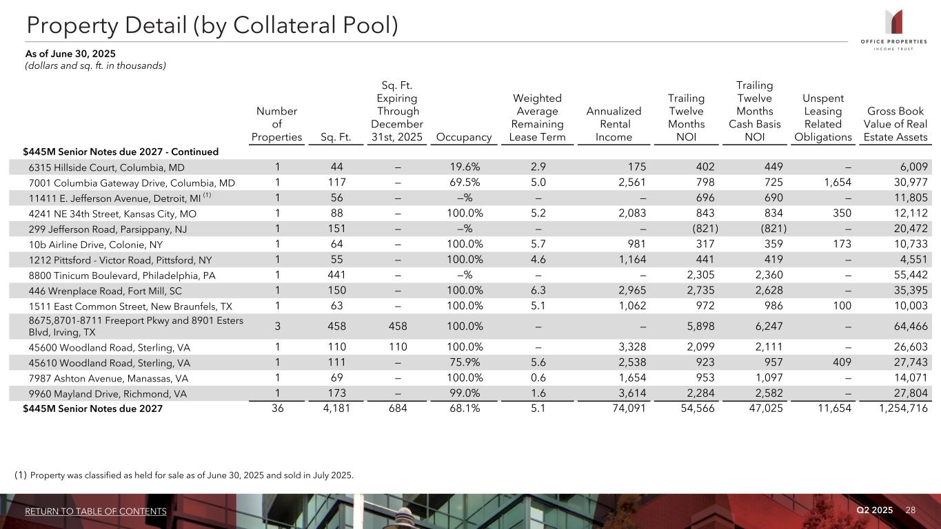 Q2 2025 27RETURN TO TABLE OF CONTENTS Property Detail (by Collateral Pool) As of June 30, 2025 (dollars and sq. ft. in thousands) Number of Properties Sq. Ft. Sq. Ft. Expiring Through December 31st, 2025 Occupancy Weighted Average Remaining Lease Term Annualized Rental Income Trailing Twelve Months NOI Trailing Twelve Months Cash Basis NOI Unspent Leasing Related Obligations Gross Book Value of Real Estate Assets $445M Senior Notes due 2027 2115 O'Nel Drive, San Jose, CA 1 99 — 100.0% 1.3 3,680 2,808 2,971 — 24,358 2544 Campbell Place, Carlsbad, CA 1 45 — 100.0% 7.1 1,268 704 194 1,109 6,882 47131 Bayside Parkway, Fremont, CA 1 101 — 100.0% 12.5 3,190 2,172 1,576 504 18,407 11 Dupont Circle, NW, Washington, D.C. 1 159 — 74.7% 7.0 7,139 4,032 2,871 172 110,191 1401 K Street, NW, Washington, D.C. 1 130 — 57.7% 5.3 3,950 1,625 1,604 7 85,274 20 Massachusetts Avenue NW, Washington, D.C. (1) 1 188 — —% — — 5,974 1,847 — 283,797 625 Indiana Avenue, NW, Washington, D.C. 1 165 — 94.7% 6.2 7,696 4,593 4,394 — 65,225 8900 Grand Oak Circle, Tampa, FL 1 68 — 100.0% 6.7 2,070 1,000 1,003 — 15,558 100 North Washington Street, Boston, MA 1 49 5 44.5% 1.6 991 214 256 139 27,606 126-132 North Washington Street, Boston, MA 1 13 9 100.0% 0.5 397 114 114 — 11,864 25 Newport Avenue Extension, Quincy, MA 1 93 5 100.0% 5.7 2,448 1,110 1,082 — 17,112 251 Causeway Street, Boston, MA 1 141 — —% — — (830) (843) — 30,730 10320 Little Patuxent Parkway, Columbia, MD 1 155 9 48.6% 3.4 2,307 677 744 9 32,194 2009-2011 Commerce Park Drive, Annapolis, MD 1 51 — 100.0% 11.8 1,832 1,163 1,007 — 11,622 4201 Patterson Avenue, Baltimore, MD 1 85 85 100.0% 0.3 1,348 631 623 — 12,011 520 Gaither Road, Rockville, MD 1 139 — 100.0% 6.7 3,902 2,164 995 5,523 45,817 530 Gaither Road, Rockville, MD 1 216 — 100.0% 4.6 7,069 3,756 3,320 888 61,087 534 Gaither Road, Rockville, MD 1 3 — 100.0% 11.4 22 (40) (40) — 609 540 Gaither Road, Rockville, MD 1 131 3 63.5% 1.9 2,657 1,854 1,684 617 36,186 (1) Sq. Ft. excludes 240 square feet under a hotel management agreement.