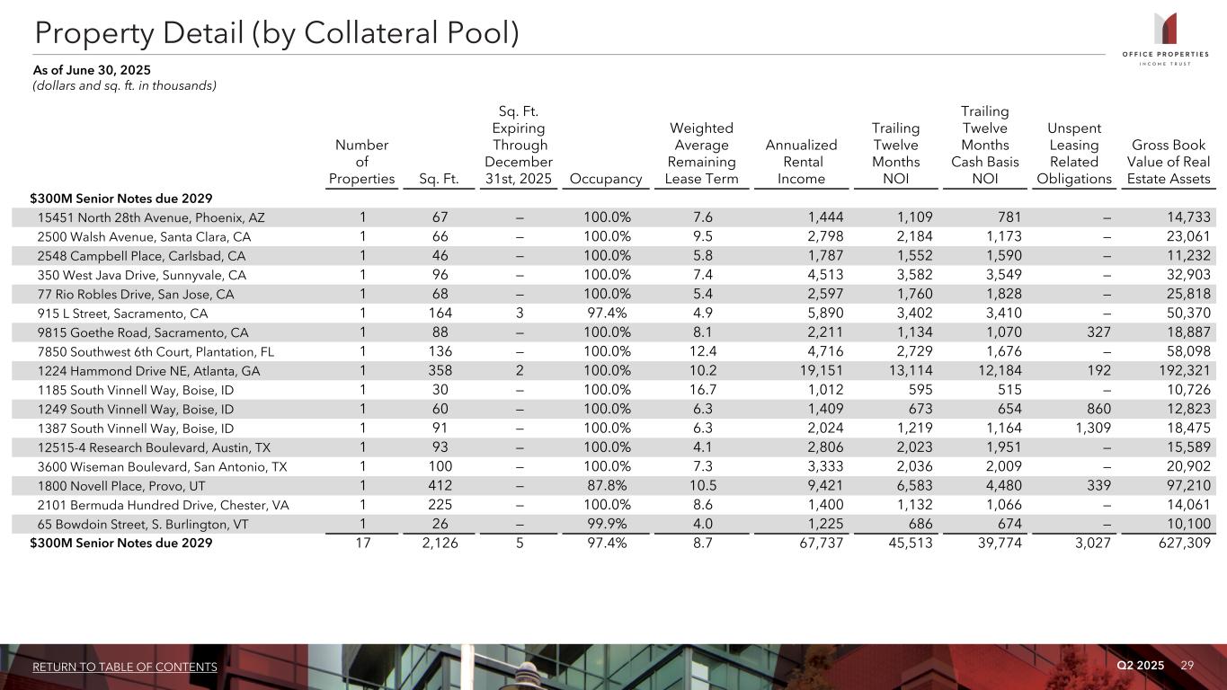 Q2 2025 28RETURN TO TABLE OF CONTENTS Property Detail (by Collateral Pool) As of June 30, 2025 (dollars and sq. ft. in thousands) Number of Properties Sq. Ft. Sq. Ft. Expiring Through December 31st, 2025 Occupancy Weighted Average Remaining Lease Term Annualized Rental Income Trailing Twelve Months NOI Trailing Twelve Months Cash Basis NOI Unspent Leasing Related Obligations Gross Book Value of Real Estate Assets $445M Senior Notes due 2027 - Continued 6315 Hillside Court, Columbia, MD 1 44 — 19.6% 2.9 175 402 449 — 6,009 7001 Columbia Gateway Drive, Columbia, MD 1 117 — 69.5% 5.0 2,561 798 725 1,654 30,977 11411 E. Jefferson Avenue, Detroit, MI (1) 1 56 — —% — — 696 690 — 11,805 4241 NE 34th Street, Kansas City, MO 1 88 — 100.0% 5.2 2,083 843 834 350 12,112 299 Jefferson Road, Parsippany, NJ 1 151 — —% — — (821) (821) — 20,472 10b Airline Drive, Colonie, NY 1 64 — 100.0% 5.7 981 317 359 173 10,733 1212 Pittsford - Victor Road, Pittsford, NY 1 55 — 100.0% 4.6 1,164 441 419 — 4,551 8800 Tinicum Boulevard, Philadelphia, PA 1 441 — —% — — 2,305 2,360 — 55,442 446 Wrenplace Road, Fort Mill, SC 1 150 — 100.0% 6.3 2,965 2,735 2,628 — 35,395 1511 East Common Street, New Braunfels, TX 1 63 — 100.0% 5.1 1,062 972 986 100 10,003 8675,8701-8711 Freeport Pkwy and 8901 Esters Blvd, Irving, TX 3 458 458 100.0% — — 5,898 6,247 — 64,466 45600 Woodland Road, Sterling, VA 1 110 110 100.0% — 3,328 2,099 2,111 — 26,603 45610 Woodland Road, Sterling, VA 1 111 — 75.9% 5.6 2,538 923 957 409 27,743 7987 Ashton Avenue, Manassas, VA 1 69 — 100.0% 0.6 1,654 953 1,097 — 14,071 9960 Mayland Drive, Richmond, VA 1 173 — 99.0% 1.6 3,614 2,284 2,582 — 27,804 $445M Senior Notes due 2027 36 4,181 684 68.1% 5.1 74,091 54,566 47,025 11,654 1,254,716 (1) Property was classified as held for sale as of June 30, 2025 and sold in July 2025.