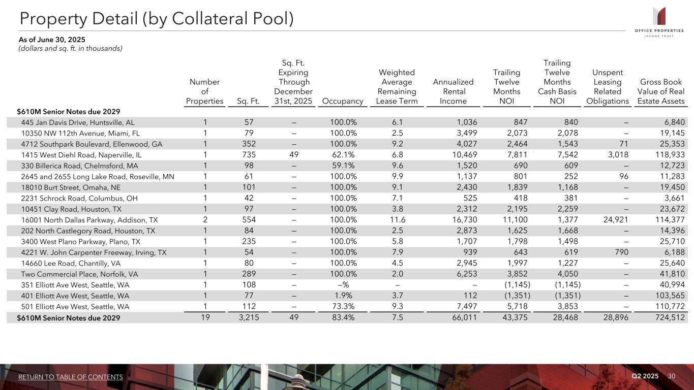 Q2 2025 29RETURN TO TABLE OF CONTENTS Property Detail (by Collateral Pool) As of June 30, 2025 (dollars and sq. ft. in thousands) Number of Properties Sq. Ft. Sq. Ft. Expiring Through December 31st, 2025 Occupancy Weighted Average Remaining Lease Term Annualized Rental Income Trailing Twelve Months NOI Trailing Twelve Months Cash Basis NOI Unspent Leasing Related Obligations Gross Book Value of Real Estate Assets $300M Senior Notes due 2029 15451 North 28th Avenue, Phoenix, AZ 1 67 — 100.0% 7.6 1,444 1,109 781 — 14,733 2500 Walsh Avenue, Santa Clara, CA 1 66 — 100.0% 9.5 2,798 2,184 1,173 — 23,061 2548 Campbell Place, Carlsbad, CA 1 46 — 100.0% 5.8 1,787 1,552 1,590 — 11,232 350 West Java Drive, Sunnyvale, CA 1 96 — 100.0% 7.4 4,513 3,582 3,549 — 32,903 77 Rio Robles Drive, San Jose, CA 1 68 — 100.0% 5.4 2,597 1,760 1,828 — 25,818 915 L Street, Sacramento, CA 1 164 3 97.4% 4.9 5,890 3,402 3,410 — 50,370 9815 Goethe Road, Sacramento, CA 1 88 — 100.0% 8.1 2,211 1,134 1,070 327 18,887 7850 Southwest 6th Court, Plantation, FL 1 136 — 100.0% 12.4 4,716 2,729 1,676 — 58,098 1224 Hammond Drive NE, Atlanta, GA 1 358 2 100.0% 10.2 19,151 13,114 12,184 192 192,321 1185 South Vinnell Way, Boise, ID 1 30 — 100.0% 16.7 1,012 595 515 — 10,726 1249 South Vinnell Way, Boise, ID 1 60 — 100.0% 6.3 1,409 673 654 860 12,823 1387 South Vinnell Way, Boise, ID 1 91 — 100.0% 6.3 2,024 1,219 1,164 1,309 18,475 12515-4 Research Boulevard, Austin, TX 1 93 — 100.0% 4.1 2,806 2,023 1,951 — 15,589 3600 Wiseman Boulevard, San Antonio, TX 1 100 — 100.0% 7.3 3,333 2,036 2,009 — 20,902 1800 Novell Place, Provo, UT 1 412 — 87.8% 10.5 9,421 6,583 4,480 339 97,210 2101 Bermuda Hundred Drive, Chester, VA 1 225 — 100.0% 8.6 1,400 1,132 1,066 — 14,061 65 Bowdoin Street, S. Burlington, VT 1 26 — 99.9% 4.0 1,225 686 674 — 10,100 $300M Senior Notes due 2029 17 2,126 5 97.4% 8.7 67,737 45,513 39,774 3,027 627,309