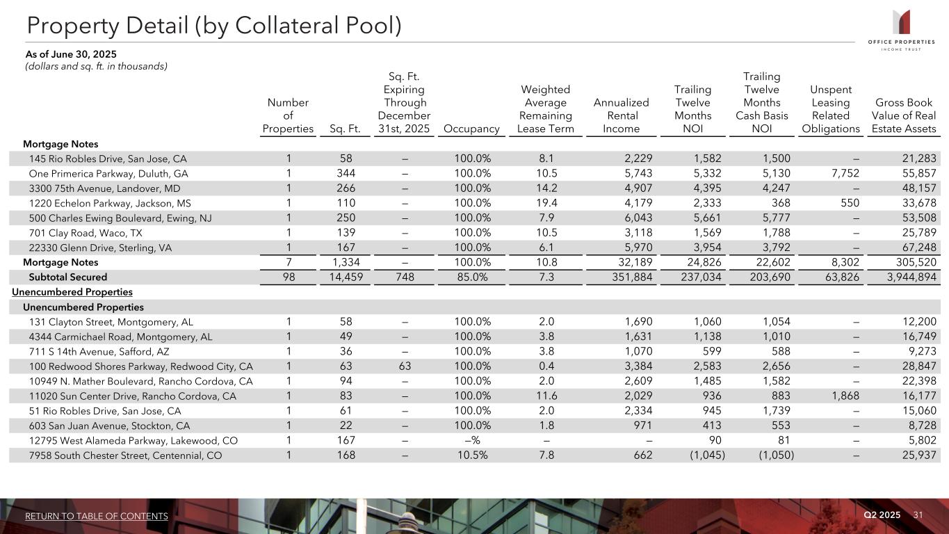 Q2 2025 30RETURN TO TABLE OF CONTENTS Property Detail (by Collateral Pool) As of June 30, 2025 (dollars and sq. ft. in thousands) Number of Properties Sq. Ft. Sq. Ft. Expiring Through December 31st, 2025 Occupancy Weighted Average Remaining Lease Term Annualized Rental Income Trailing Twelve Months NOI Trailing Twelve Months Cash Basis NOI Unspent Leasing Related Obligations Gross Book Value of Real Estate Assets $610M Senior Notes due 2029 445 Jan Davis Drive, Huntsville, AL 1 57 — 100.0% 6.1 1,036 847 840 — 6,840 10350 NW 112th Avenue, Miami, FL 1 79 — 100.0% 2.5 3,499 2,073 2,078 — 19,145 4712 Southpark Boulevard, Ellenwood, GA 1 352 — 100.0% 9.2 4,027 2,464 1,543 71 25,353 1415 West Diehl Road, Naperville, IL 1 735 49 62.1% 6.8 10,469 7,811 7,811 7,542 3,018 118,933 330 Billerica Road, Chelmsford, MA 1 98 — 59.1% 9.6 1,520 690 609 — 12,723 2645 and 2655 Long Lake Road, Roseville, MN 1 61 — 100.0% 9.9 1,137 801 252 96 11,283 18010 Burt Street, Omaha, NE 1 101 — 100.0% 9.1 2,430 1,839 1,168 — 19,450 2231 Schrock Road, Columbus, OH 1 42 — 100.0% 7.1 525 418 381 — 3,661 10451 Clay Road, Houston, TX 1 97 — 100.0% 3.8 2,312 2,195 2,259 — 23,672 16001 North Dallas Parkway, Addison, TX 2 554 — 100.0% 11.6 16,730 11,100 1,377 24,921 114,377 202 North Castlegory Road, Houston, TX 1 84 — 100.0% 2.5 2,873 1,625 1,668 — 14,396 3400 West Plano Parkway, Plano, TX 1 235 — 100.0% 5.8 1,707 1,798 1,498 — 25,710 4221 W. John Carpenter Freeway, Irving, TX 1 54 — 100.0% 7.9 939 643 619 790 6,188 14660 Lee Road, Chantilly, VA 1 80 — 100.0% 4.5 2,945 1,997 1,227 — 25,640 Two Commercial Place, Norfolk, VA 1 289 — 100.0% 2.0 6,253 3,852 4,050 — 41,810 351 Elliott Ave West, Seattle, WA 1 108 — —% — — (1,145) (1,145) — 40,994 401 Elliott Ave West, Seattle, WA 1 77 — 1.9% 3.7 112 (1,351) (1,351) — 103,565 501 Elliott Ave West, Seattle, WA 1 112 — 73.3% 9.3 7,497 5,718 3,853 — 110,772 $610M Senior Notes due 2029 19 3,215 49 83.4% 7.5 66,011 43,375 28,468 28,896 724,512