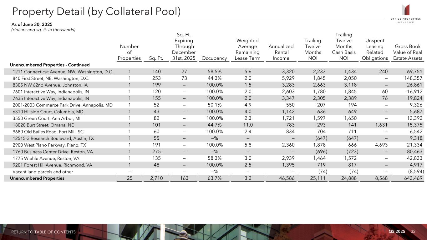 Q2 2025 31RETURN TO TABLE OF CONTENTS Property Detail (by Collateral Pool) As of June 30, 2025 (dollars and sq. ft. in thousands) Number of Properties Sq. Ft. Sq. Ft. Expiring Through December 31st, 2025 Occupancy Weighted Average Remaining Lease Term Annualized Rental Income Trailing Twelve Months NOI Trailing Twelve Months Cash Basis NOI Unspent Leasing Related Obligations Gross Book Value of Real Estate Assets Mortgage Notes 145 Rio Robles Drive, San Jose, CA 1 58 — 100.0% 8.1 2,229 1,582 1,500 — 21,283 One Primerica Parkway, Duluth, GA 1 344 — 100.0% 10.5 5,743 5,332 5,130 7,752 55,857 3300 75th Avenue, Landover, MD 1 266 — 100.0% 14.2 4,907 4,395 4,247 — 48,157 1220 Echelon Parkway, Jackson, MS 1 110 — 100.0% 19.4 4,179 2,333 368 550 33,678 500 Charles Ewing Boulevard, Ewing, NJ 1 250 — 100.0% 7.9 6,043 5,661 5,777 — 53,508 701 Clay Road, Waco, TX 1 139 — 100.0% 10.5 3,118 1,569 1,788 — 25,789 22330 Glenn Drive, Sterling, VA 1 167 — 100.0% 6.1 5,970 3,954 3,792 — 67,248 Mortgage Notes 7 1,334 — 100.0% 10.8 32,189 24,826 22,602 8,302 305,520 Subtotal Secured 98 14,459 748 85.0% 7.3 351,884 237,034 203,690 63,826 3,944,894 Unencumbered Properties Unencumbered Properties 131 Clayton Street, Montgomery, AL 1 58 — 100.0% 2.0 1,690 1,060 1,054 — 12,200 4344 Carmichael Road, Montgomery, AL 1 49 — 100.0% 3.8 1,631 1,138 1,010 — 16,749 711 S 14th Avenue, Safford, AZ 1 36 — 100.0% 3.8 1,070 599 588 — 9,273 100 Redwood Shores Parkway, Redwood City, CA 1 63 63 100.0% 0.4 3,384 2,583 2,656 — 28,847 10949 N. Mather Boulevard, Rancho Cordova, CA 1 94 — 100.0% 2.0 2,609 1,485 1,582 — 22,398 11020 Sun Center Drive, Rancho Cordova, CA 1 83 — 100.0% 11.6 2,029 936 883 1,868 16,177 51 Rio Robles Drive, San Jose, CA 1 61 — 100.0% 2.0 2,334 945 1,739 — 15,060 603 San Juan Avenue, Stockton, CA 1 22 — 100.0% 1.8 971 413 553 — 8,728 12795 West Alameda Parkway, Lakewood, CO 1 167 — —% — — 90 81 — 5,802 7958 South Chester Street, Centennial, CO 1 168 — 10.5% 7.8 662 (1,045) (1,050) — 25,937
