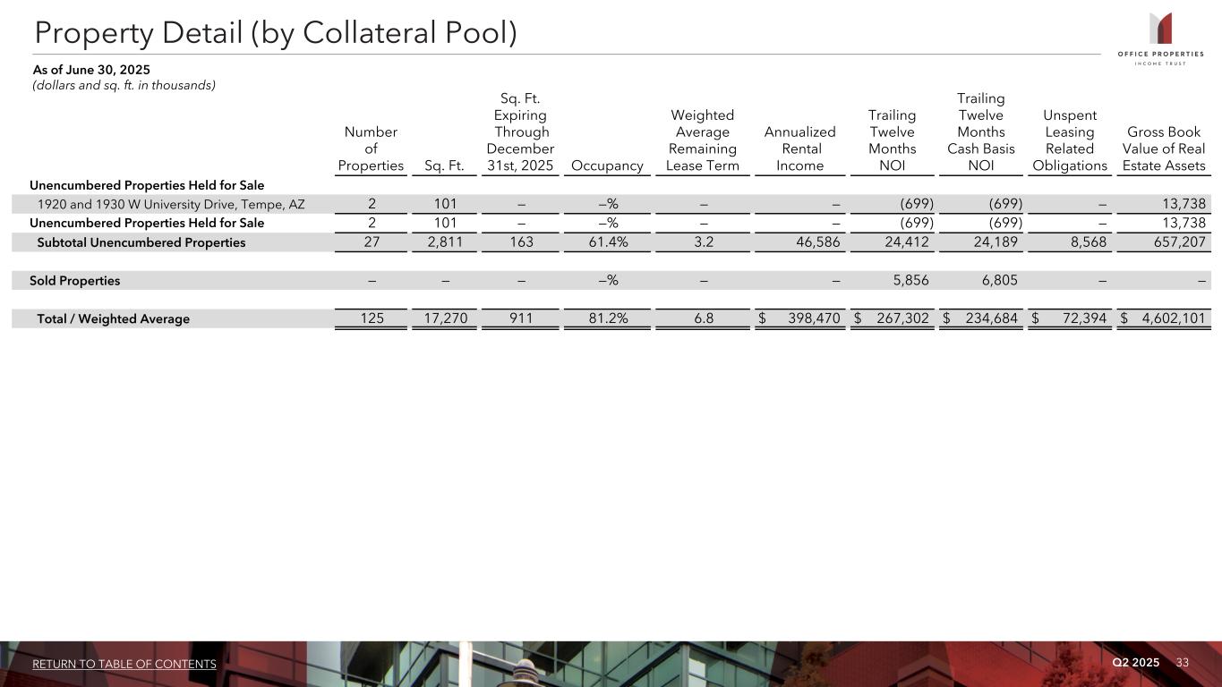 Q2 2025 33RETURN TO TABLE OF CONTENTS Property Detail (by Collateral Pool) As of June 30, 2025 (dollars and sq. ft. in thousands) Number of Properties Sq. Ft. Sq. Ft. Expiring Through December 31st, 2025 Occupancy Weighted Average Remaining Lease Term Annualized Rental Income Trailing Twelve Months NOI Trailing Twelve Months Cash Basis NOI Unspent Leasing Related Obligations Gross Book Value of Real Estate Assets Unencumbered Properties Held for Sale 1920 and 1930 W University Drive, Tempe, AZ 2 101 — —% — — (699) (699) — 13,738 Unencumbered Properties Held for Sale 2 101 — —% — — (699) (699) — 13,738 Subtotal Unencumbered Properties 27 2,811 163 61.4% 3.2 46,586 24,412 24,189 8,568 657,207 Sold Properties — — — —% — — 5,856 6,805 — — Total / Weighted Average 125 17,270 911 81.2% 6.8 $ 398,470 $ 267,302 $ 234,684 $ 72,394 $ 4,602,101