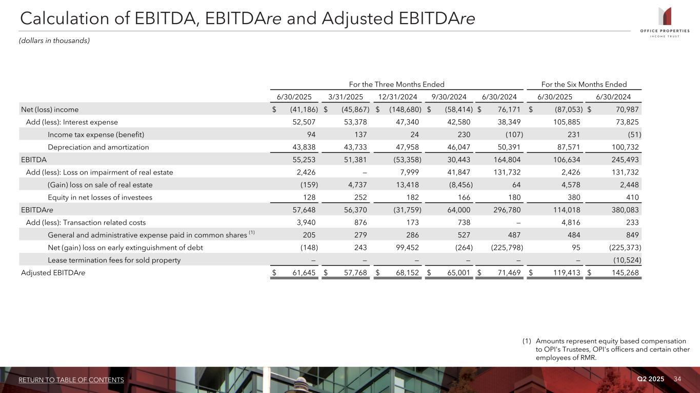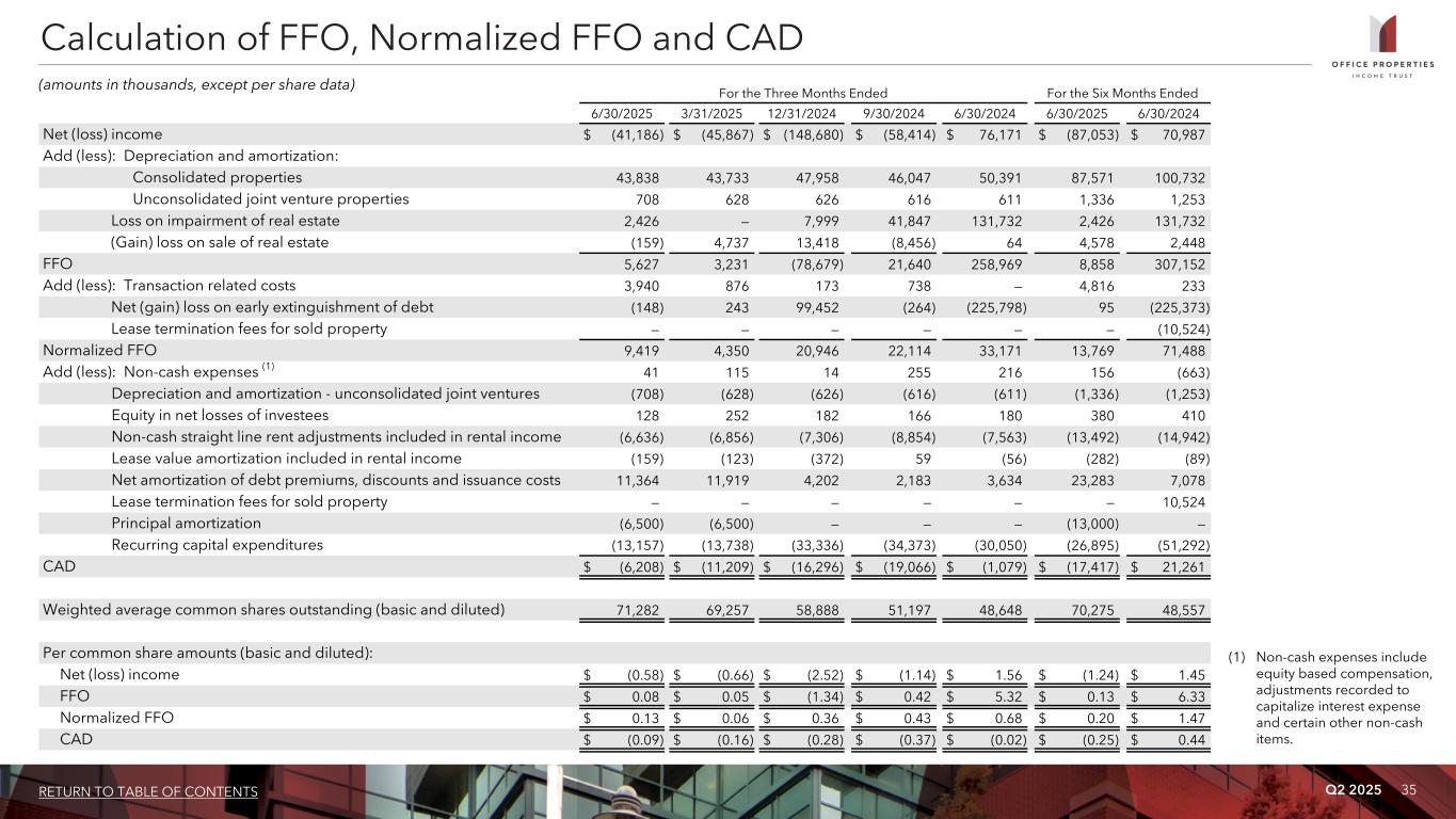 Q2 2025 34RETURN TO TABLE OF CONTENTS For the Three Months Ended For the Six Months Ended 6/30/2025 3/31/2025 12/31/2024 9/30/2024 6/30/2024 6/30/2025 6/30/2024 Net (loss) income $ (41,186) $ (45,867) $ (148,680) $ (58,414) $ 76,171 $ (87,053) $ 70,987 Add (less): Interest expense 52,507 53,378 47,340 42,580 38,349 105,885 73,825 Income tax expense (benefit) 94 137 24 230 (107) 231 (51) Depreciation and amortization 43,838 43,733 47,958 46,047 50,391 87,571 100,732 EBITDA 55,253 51,381 (53,358) 30,443 164,804 106,634 245,493 Add (less): Loss on impairment of real estate 2,426 — 7,999 41,847 131,732 2,426 131,732 (Gain) loss on sale of real estate (159) 4,737 13,418 (8,456) 64 4,578 2,448 Equity in net losses of investees 128 252 182 166 180 380 410 EBITDAre 57,648 56,370 (31,759) 64,000 296,780 114,018 380,083 Add (less): Transaction related costs 3,940 876 173 738 — 4,816 233 General and administrative expense paid in common shares (1) 205 279 286 527 487 484 849 Net (gain) loss on early extinguishment of debt (148) 243 99,452 (264) (225,798) 95 (225,373) Lease termination fees for sold property — — — — — — (10,524) Adjusted EBITDAre $ 61,645 $ 57,768 $ 68,152 $ 65,001 $ 71,469 $ 119,413 $ 145,268 Calculation of EBITDA, EBITDAre and Adjusted EBITDAre (dollars in thousands) (1) Amounts represent equity based compensation to OPI's Trustees, OPI's officers and certain other employees of RMR.