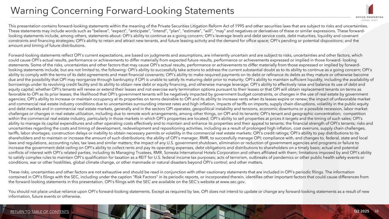 37RETURN TO TABLE OF CONTENTS Q2 2025 Adjusted total assets and total unencumbered assets include the original cost of real estate assets calculated in accordance with GAAP before impairment writedowns, if any, and exclude depreciation and amortization, accounts receivable and intangible assets, as defined in OPI's debt agreements. Unencumbered assets is calculated as adjusted total assets for properties not securing debt. Annualized dividend yield is the annualized dividend per common share paid during the period divided by the closing price of OPI's common shares at the end of the period. Annualized rental income is calculated using the annualized contractual base rents from OPI's tenants pursuant to its lease agreements as of June 30, 2025, plus straight line rent adjustments and estimated recurring expense reimbursements to be paid to OPI, and excluding lease value amortization. Building improvements generally include expenditures to replace obsolete building components and expenditures that extend the useful life of existing assets. Consolidated income available for debt service is earnings from operations excluding interest expense, depreciation and amortization, loss on asset impairment, gains and losses on early extinguishment of debt, gains and losses on sales of properties and equity in earnings of OPI's unconsolidated joint venture and including distributions from OPI's unconsolidated joint venture, if any, determined together with debt service for the period presented. Development, redevelopment and other activities generally include capital expenditure projects that reposition a property or result in new sources of revenue. GAAP is U.S. generally accepted accounting principles. Gross book value of real estate assets is real estate properties at cost calculated in accordance with GAAP, plus certain acquisition costs, if any, before depreciation and purchase price allocations, less impairment writedowns, if any. Gross sales price is equal to the gross contract price and excludes closing costs. Investment grade tenants include: (a) investment grade rated tenants; (b) tenants with investment grade rated parent entities that guarantee the tenant's lease obligations; and/or (c) tenants with investment grade rated parent entities that do not guarantee the tenant's lease obligations. Tenants contributing 51.0% of annualized rental income as of June 30, 2025 were investment grade rated (or their payment obligations were guaranteed by an investment grade rated parent) and tenants contributing an additional 7.7% of annualized rental income as of June 30, 2025 were subsidiaries of an investment grade rated parent (although these parent entities are not liable for the payment of rents). Lease related costs generally include capital expenditures used to improve tenants' space or amounts paid directly to tenants to improve their space and leasing related costs, such as brokerage commissions and tenant inducements. Leased square feet is pursuant to leases existing as of June 30, 2025, and includes (i) space being fitted out for tenant occupancy pursuant to OPI's lease agreements, if any, and (ii) space which is leased, but is not occupied or is being offered for sublease by tenants, if any. Square footage measurements are subject to changes when space is remeasured or reconfigured for new tenants. Leasing cost and concession commitments include commitments made for leasing expenditures and concessions, such as tenant improvements, leasing commissions, tenant reimbursements and free rent. Net debt is total debt less cash. Percent leased includes (i) space being fitted out for occupancy pursuant to OPI's lease agreements, if any, and (ii) space which is leased, but is not occupied or is being offered for sublease by tenants, if any, as of the measurement date. REIT is real estate investment trust. Rentable square feet represents total square feet available for lease as of the measurement date. Square footage measurements are subject to changes when space is remeasured or reconfigured for new tenants. Rolling four quarter CAD represents CAD for the preceding twelve month period as of the respective quarter end date. Same properties for the three months ended June 30, 2025 is based on properties OPI owned continuously since April 1, 2024; excludes three properties classified as held for sale, five properties affected by significant redevelopment activities and two properties owned by an unconsolidated joint venture in which OPI owns a 51% interest. Same properties for the six months ended June 30, 2025 is based on properties OPI owned continuously since January 1, 2024; excludes three properties classified as held for sale, five properties affected by significant redevelopment activities and two properties owned by an unconsolidated joint venture in which OPI owns a 51% interest. Same property cash basis NOI % margin is Same Property Cash Basis NOI as a percentage of same property cash basis rental income. Cash basis rental income excludes non-cash straightline rent adjustments, the net effect of non-cash amortization of intangible lease assets and liabilities and lease termination fees, if any. Same property NOI % margin is Same Property NOI as a percentage of same property rental income. SOFR is the secured overnight financing rate. Total debt represents the outstanding principal balance as of the date reported. Total gross assets is total assets plus accumulated depreciation. Weighted average remaining lease term is the average remaining lease term in years weighted based on annualized rental income. Non-GAAP Financial Measures and Certain Definitions (Continued)