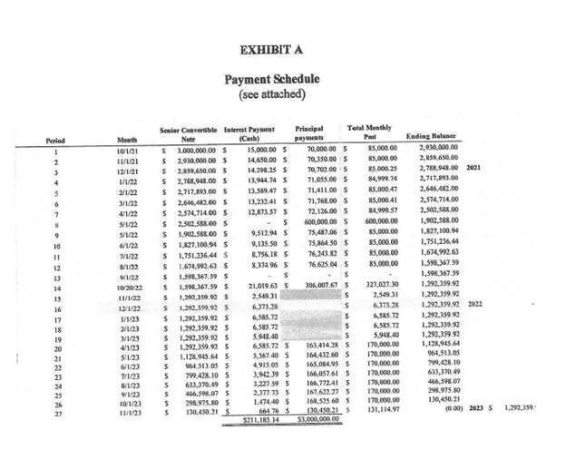 C. Borrower has requested that Lender amend the payment terms of the Note to be interest only for the period starting November 1, 2022 though and including March 31, 2023, with payments of principal and interest to resume starting April 1, 2023 by replacing the existing payment schedule with the new payment schedule attached hereto as Exhibit A (the “Amended Payment Schedule”);