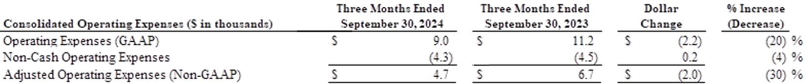 General and Administrative expense for the three months ended September 30, 2024 was $4.3 million versus $4.5 million for the comparable 2023 period, a decrease of approximately 3%. The decrease was largely due to reduced salary and benefits related expenses and a decrease in non-cash stock-based compensation.