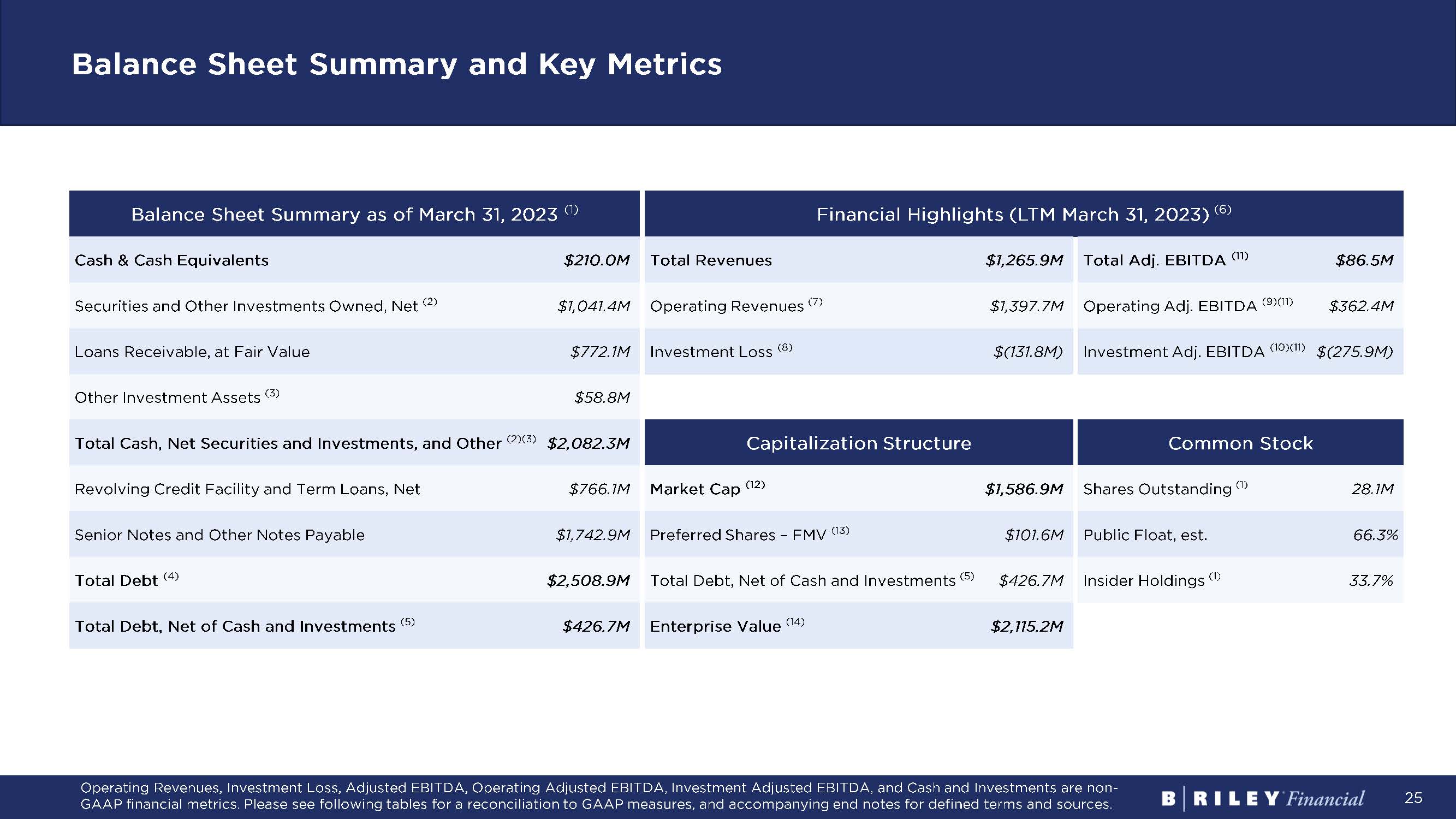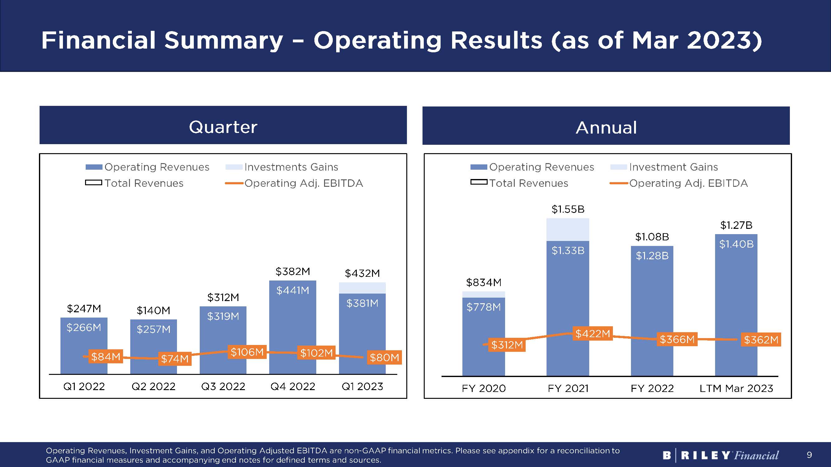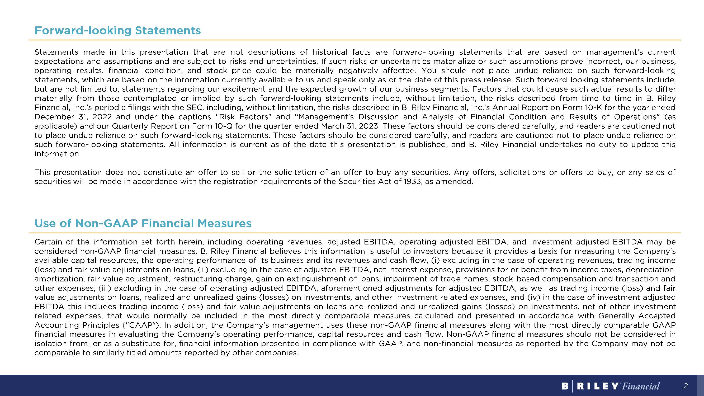 2 Forward - looking Statements Statements made in this presentation that are not descriptions of historical facts are forward - looking statements that are based on management’s current expectations and assumptions and are subject to risks and uncertainties . If such risks or uncertainties materialize or such assumptions prove incorrect, our business, operating results, financial condition, and stock price could be materially negatively affected . You should not place undue reliance on such forward - looking statements, which are based on the information currently available to us and speak only as of the date of this press release . Such forward - looking statements include, but are not limited to, statements regarding our excitement and the expected growth of our business segments . Factors that could cause such actual results to differ materially from those contemplated or implied by such forward - looking statements include, without limitation, the risks described from time to time in B . Riley Financial, Inc . ’s periodic filings with the SEC, including, without limitation, the risks described in B . Riley Financial, Inc . ’s Annual Report on Form 10 - K for the year ended December 31 , 2022 and under the captions “Risk Factors” and “Management's Discussion and Analysis of Financial Condition and Results of Operations” (as applicable) and our Quarterly Report on Form 10 - Q for the quarter ended March 31 , 2023 . These factors should be considered carefully, and readers are cautioned not to place undue reliance on such forward - looking statements . These factors should be considered carefully, and readers are cautioned not to place undue reliance on such forward - looking statements . All information is current as of the date this presentation is published, and B . Riley Financial undertakes no duty to update this information . This presentation does not constitute an offer to sell or the solicitation of an offer to buy any securities . Any offers, solicitations or offers to buy, or any sales of securities will be made in accordance with the registration requirements of the Securities Act of 1933 , as amended . Use of Non - GAAP Financial Measures Certain of the information set forth herein, including operating revenues, adjusted EBITDA, operating adjusted EBITDA, and investment adjusted EBITDA may be considered non - GAAP financial measures . B . Riley Financial believes this information is useful to investors because it provides a basis for measuring the Company's available capital resources, the operating performance of its business and its revenues and cash flow, ( i ) excluding in the case of operating revenues, trading income (loss) and fair value adjustments on loans, (ii) excluding in the case of adjusted EBITDA, net interest expense, provisions for or benefit from income taxes, depreciation, amortization, fair value adjustment, restructuring charge, gain on extinguishment of loans, impairment of trade names, stock - based compensation and transaction and other expenses, (iii) excluding in the case of operating adjusted EBITDA, aforementioned adjustments for adjusted EBITDA, as well as trading income (loss) and fair value adjustments on loans, realized and unrealized gains (losses) on investments, and other investment related expenses, and (iv) in the case of investment adjusted EBITDA this includes trading income (loss) and fair value adjustments on loans and realized and unrealized gains (losses) on investments, net of other investment related expenses, that would normally be included in the most directly comparable measures calculated and presented in accordance with Generally Accepted Accounting Principles ("GAAP") . In addition, the Company's management uses these non - GAAP financial measures along with the most directly comparable GAAP financial measures in evaluating the Company's operating performance, capital resources and cash flow . Non - GAAP financial measures should not be considered in isolation from, or as a substitute for, financial information presented in compliance with GAAP, and non - financial measures as reported by the Company may not be comparable to similarly titled amounts reported by other companies .