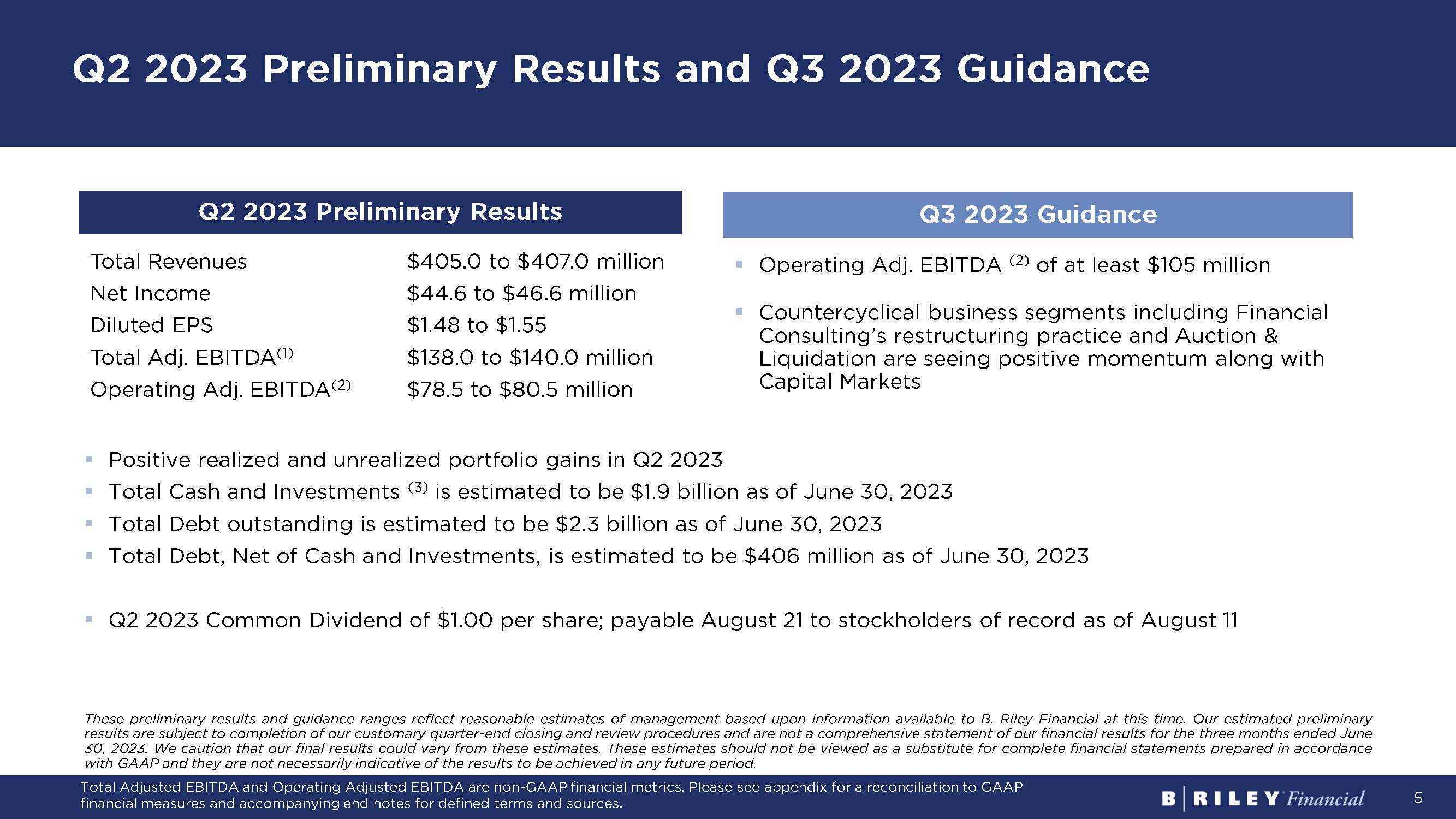 5 Q2 2023 Preliminary Results Total Revenues $405.0 to $407.0 million Net Income $44.6 to $46.6 million Diluted EPS $1.48 to $1.55 Total Adj. EBITDA (1) $138.0 to $140.0 million Operating Adj. EBITDA (2) $78.5 to $80.5 million Q3 2023 Guidance ▪ Positive realized and unrealized portfolio gains in Q 2 2023 ▪ Total Cash and Investments ( 3 ) is estimated to be $ 1 . 9 billion as of June 30 , 2023 ▪ Total Debt outstanding is estimated to be $ 2 . 3 billion as of June 30 , 2023 ▪ Total Debt, Net of Cash and Investments, is estimated to be $ 406 million as of June 30 , 2023 ▪ Q 2 2023 Common Dividend of $ 1 . 00 per share ; payable August 21 to stockholders of record as of August 11 These preliminary results and guidance ranges reflect reasonable estimates of management based upon information available to B . Riley Financial at this time . Our estimated preliminary results are subject to completion of our customary quarter - end closing and review procedures and are not a comprehensive statement of our financial results for the three months ended June 30 , 2023 . We caution that our final results could vary from these estimates . These estimates should not be viewed as a substitute for complete financial statements prepared in accordance with GAAP and they are not necessarily indicative of the results to be achieved in any future period . ▪ Operating Adj. EBITDA (2) of at least $105 million ▪ Countercyclical business segments including Financial Consulting’s restructuring practice and Auction & Liquidation are seeing positive momentum along with Capital Markets Q2 2023 Preliminary Results and Q3 2023 Guidance Total Adjusted EBITDA and Operating Adjusted EBITDA are non - GAAP financial metrics. Please see appendix for a reconciliation to GAAP financial measures and accompanying end notes for defined terms and sources.