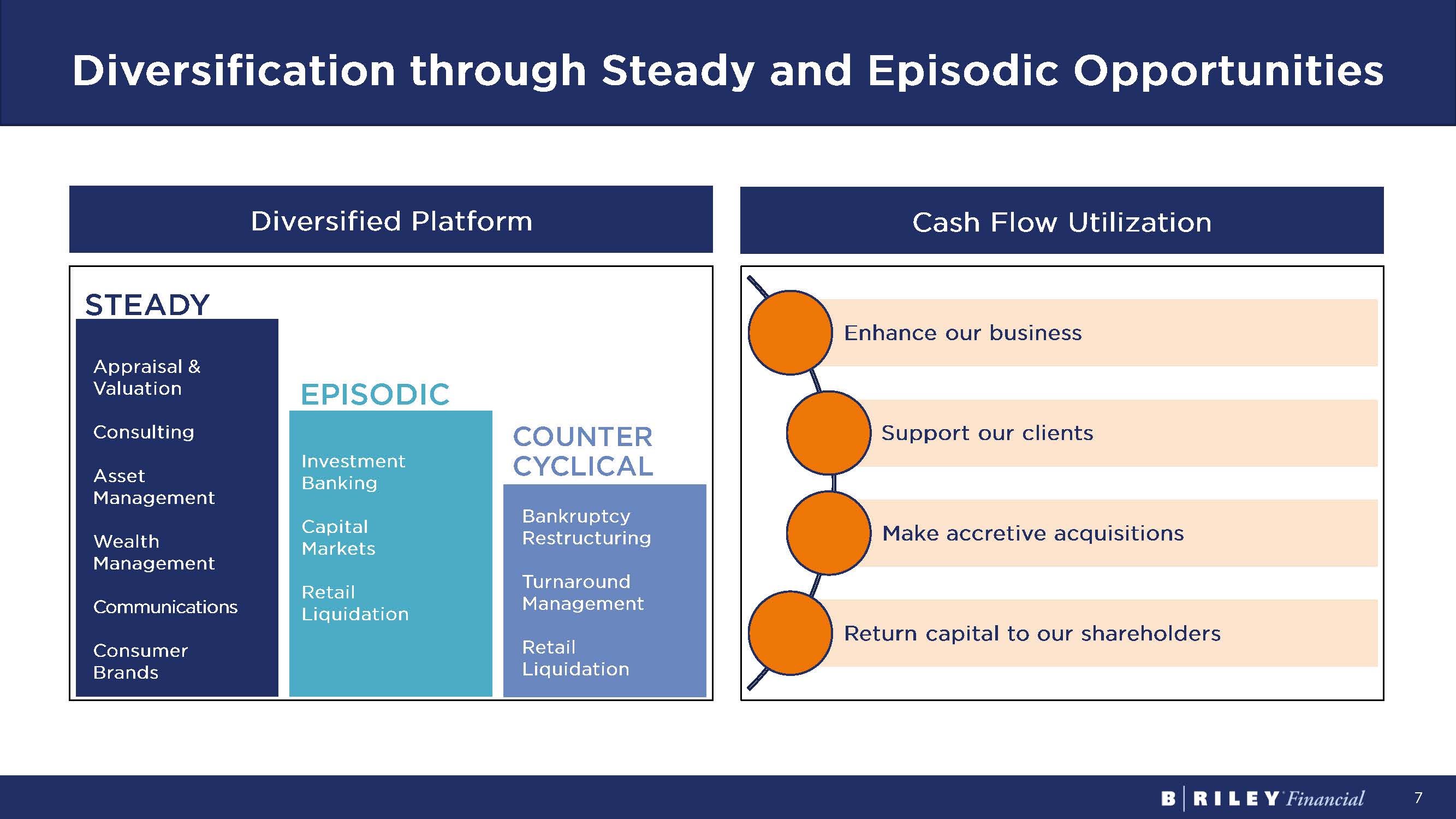 7 Diversification through Steady and Episodic Opportunities Enhance our business Support our clients Make accretive acquisitions Return capital to our shareholders Diversified Platform Cash Flow Utilization STEADY EPISODIC COUNTER CYCLICAL Appraisal & Valuation Consulting Asset Management Wealth Management Communications Consumer Brands Investment Banking Capital Markets Retail Liquidation Bankruptcy Restructuring Turnaround Management Retail Liquidation