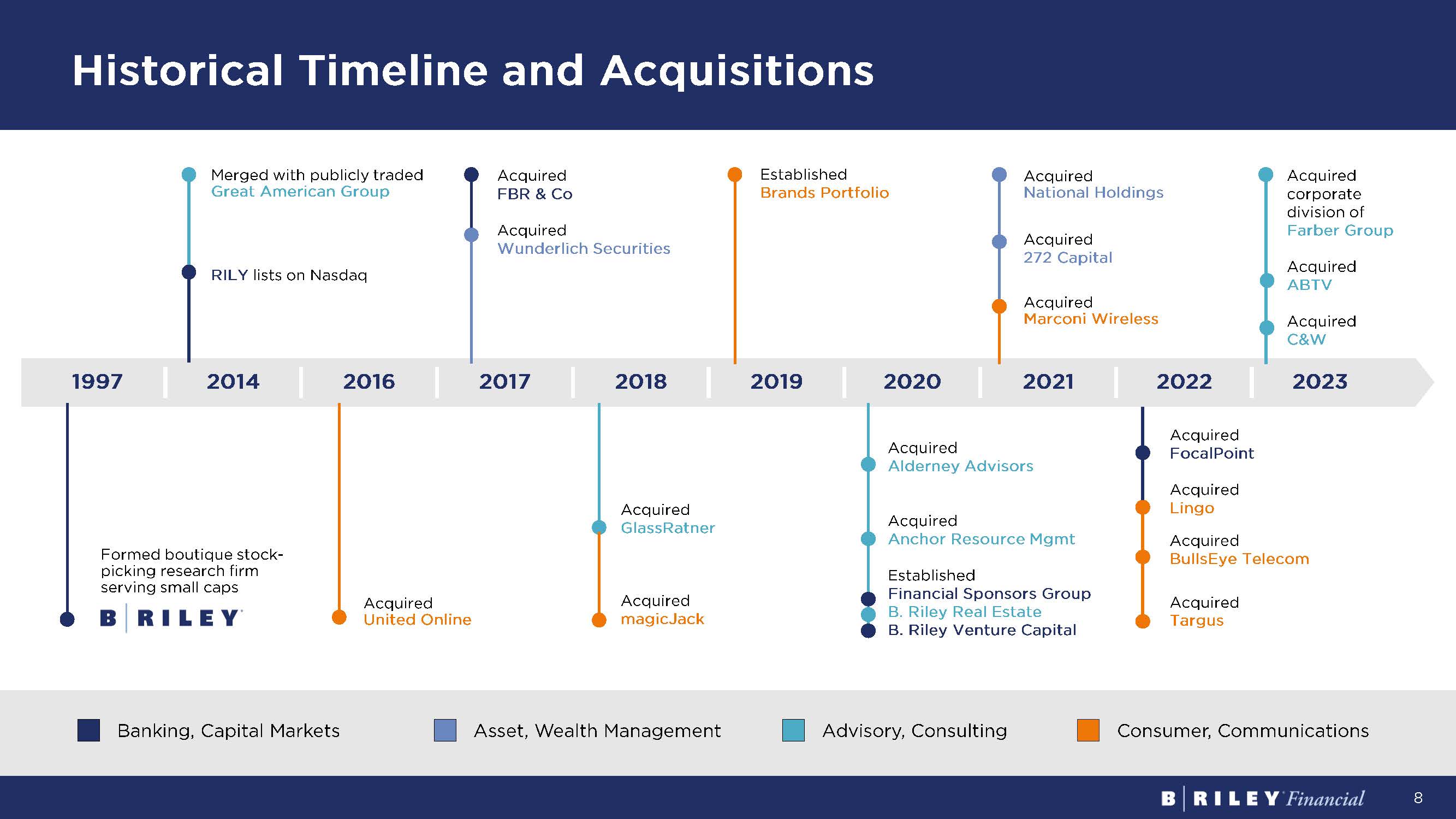 8 Historical Timeline and Acquisitions Banking, Capital Markets Asset, Wealth Management Advisory, Consulting Consumer, Communications 1997 2014 2016 2017 2018 2019 2020 2021 2022 2023 Merged with publicly traded Great American Group RILY lists on Nasdaq Acquired National Holdings Acquired 272 Capital Acquired Marconi Wireless Acquired FBR & Co Acquired Wunderlich Securities Established Brands Portfolio Formed boutique stock - picking research firm serving small caps Acquired United Online Acquired GlassRatner Acquired magicJack Acquired FocalPoint Acquired Lingo Acquired BullsEye Telecom Acquired Targus Acquired corporate division of Farber Group Acquired ABTV Acquired C&W Acquired Alderney Advisors Acquired Anchor Resource Mgmt Established Financial Sponsors Group B. Riley Real Estate B. Riley Venture Capital