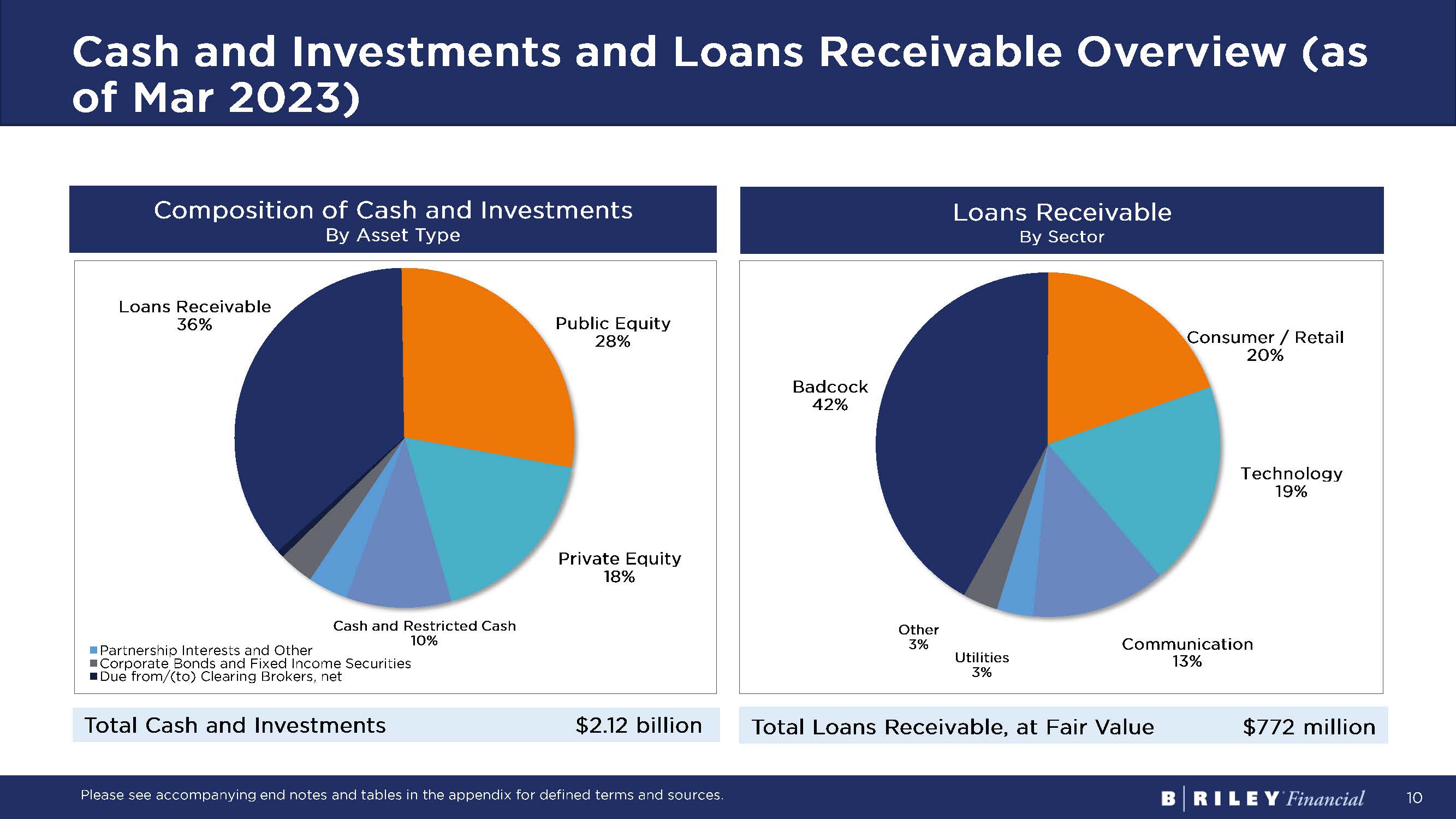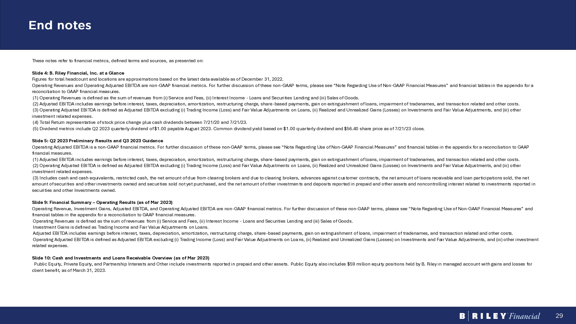 29 End notes These notes refer to financial metrics, defined terms and sources, as presented on: Slide 4: B. Riley Financial, Inc. at a Glance Figures for total headcount and locations are approximations based on the latest data available as of December 31, 2022. Operating Revenues and Operating Adjusted EBITDA are non - GAAP financial metrics. For further discussion of these non - GAAP terms, please see “Note Regarding Use of Non - GAAP Financial Measures” and financial tables in the appendix for a reconciliation to GAAP financial measures. (1) Operating Revenues is defined as the sum of revenues from (i) Service and Fees, (ii) Interest Income - Loans and Securities Lending and (iii) Sales of Goods. (2) Adjusted EBITDA includes earnings before interest, taxes, depreciation, amortization, restructuring charge, share - based pay ments, gain on extinguishment of loans, impairment of tradenames, and transaction related and other costs. (3) Operating Adjusted EBITDA is defined as Adjusted EBITDA excluding (i) Trading Income (Loss) and Fair Value Adjustments on L oans, (ii) Realized and Unrealized Gains (Losses) on Investments and Fair Value Adjustments, and (iii) other investment related expenses. (4) Total Return representative of stock price change plus cash dividends between 7/21/20 and 7/21/23. (5) Dividend metrics include Q2 2023 quarterly dividend of $1.00 payable August 2023. Common dividend yield based on $1.00 qu ar terly dividend and $56.40 share price as of 7/21/23 close. Slide 5: Q2 2023 Preliminary Results and Q3 2023 Guidance Operating Adjusted EBITDA is a non - GAAP financial metrics. For further discussion of these non - GAAP terms, please see “Note Rega rding Use of Non - GAAP Financial Measures” and financial tables in the appendix for a reconciliation to GAAP financial measures. (1) Adjusted EBITDA includes earnings before interest, taxes, depreciation, amortization, restructuring charge, share - based pay ments, gain on extinguishment of loans, impairment of tradenames, and transaction related and other costs. (2) Operating Adjusted EBITDA is defined as Adjusted EBITDA excluding (i) Trading Income (Loss) and Fair Value Adjustments on L oans, (ii) Realized and Unrealized Gains (Losses) on Investments and Fair Value Adjustments, and (iii) other investment related expenses. (3) Includes cash and cash equivalents, restricted cash, the net amount of due from clearing brokers and due to clearing brokers, ad vances against customer contracts, the net amount of loans receivable and loan participations sold, the net amount of securities and other investments owned and securities sold not yet purchased, and the net amount of other investmen ts and deposits reported in prepaid and other assets and noncontrolling interest related to investments reported in securities and other Investments owned. Slide 9: Financial Summary – Operating Results (as of Mar 2023) Operating Revenue, Investment Gains, Adjusted EBITDA, and Operating Adjusted EBITDA are non - GAAP financial metrics. For further discussion of these non - GAAP terms, please see “Note Regarding Use of Non - GAAP Financial Measures” and financial tables in the appendix for a reconciliation to GAAP financial measures. Operating Revenues is defined as the sum of revenues from (i) Service and Fees, (ii) Interest Income - Loans and Securities Len ding and (iii) Sales of Goods. Investment Gains is defined as Trading Income and Fair Value Adjustments on Loans. Adjusted EBITDA includes earnings before interest, taxes, depreciation, amortization, restructuring charge, share - based payment s, gain on extinguishment of loans, impairment of tradenames, and transaction related and other costs. Operating Adjusted EBITDA is defined as Adjusted EBITDA excluding (i) Trading Income (Loss) and Fair Value Adjustments on Loa ns , (ii) Realized and Unrealized Gains (Losses) on Investments and Fair Value Adjustments, and (iii) other investment related expenses. Slide 10: Cash and Investments and Loans Receivable Overview (as of Mar 2023) Public Equity, Private Equity, and Partnership Interests and Other include investments reported in prepaid and other assets. P ublic Equity also includes $59 million equity positions held by B. Riley in managed account with gains and losses for client benefit, as of March 31, 2023.