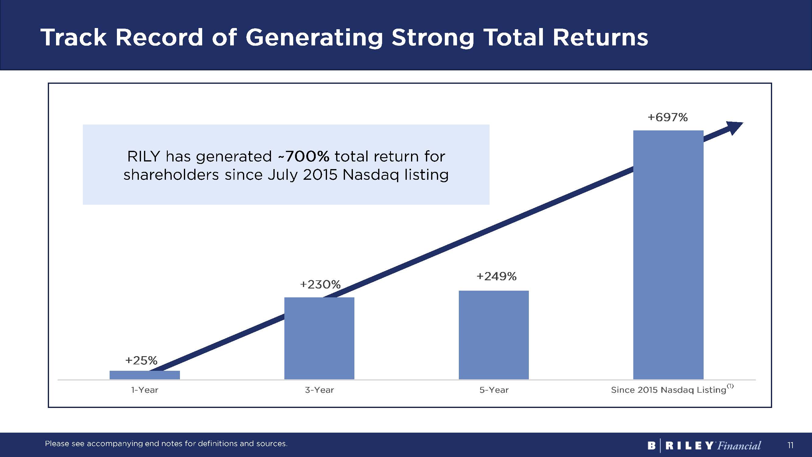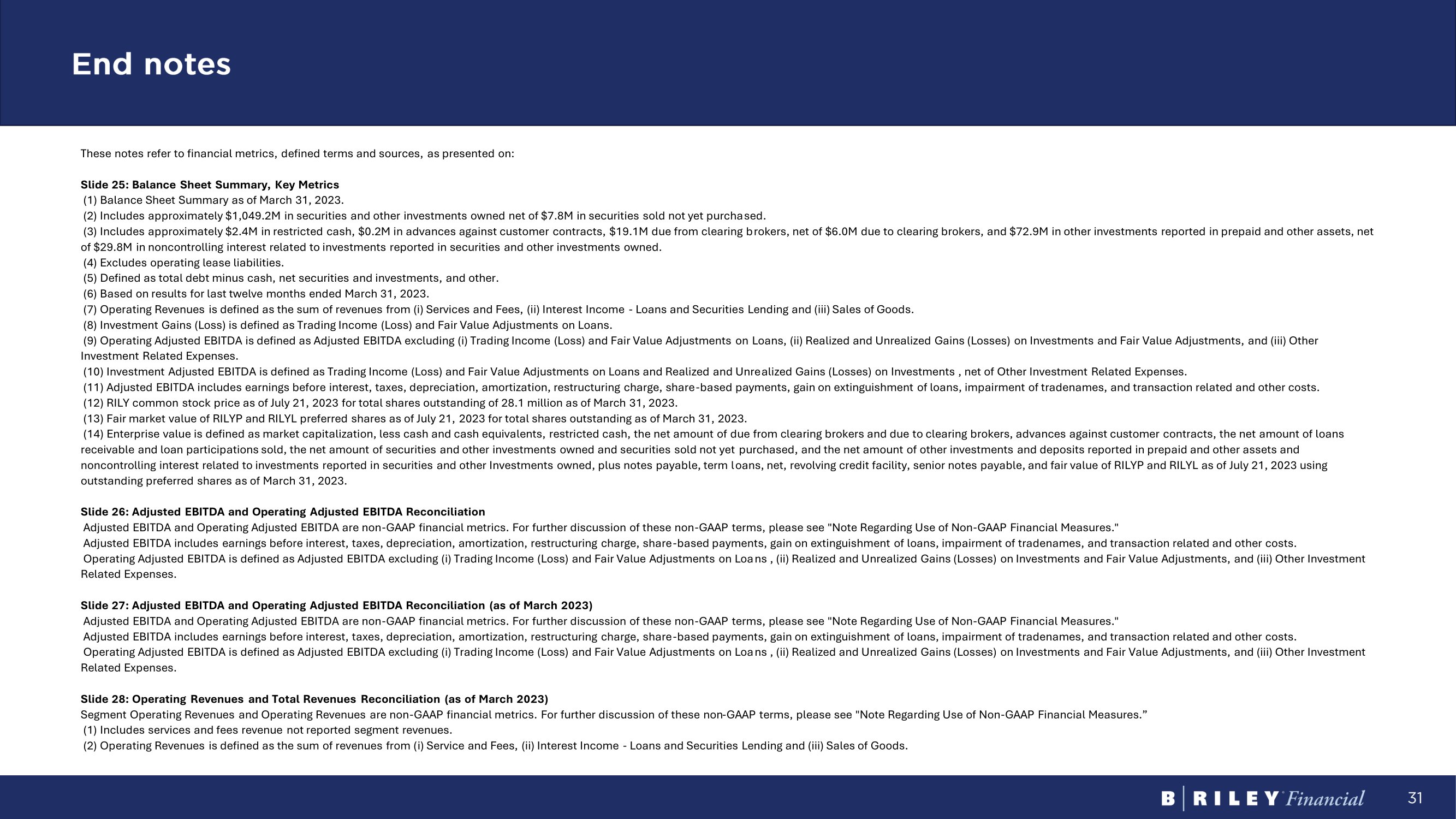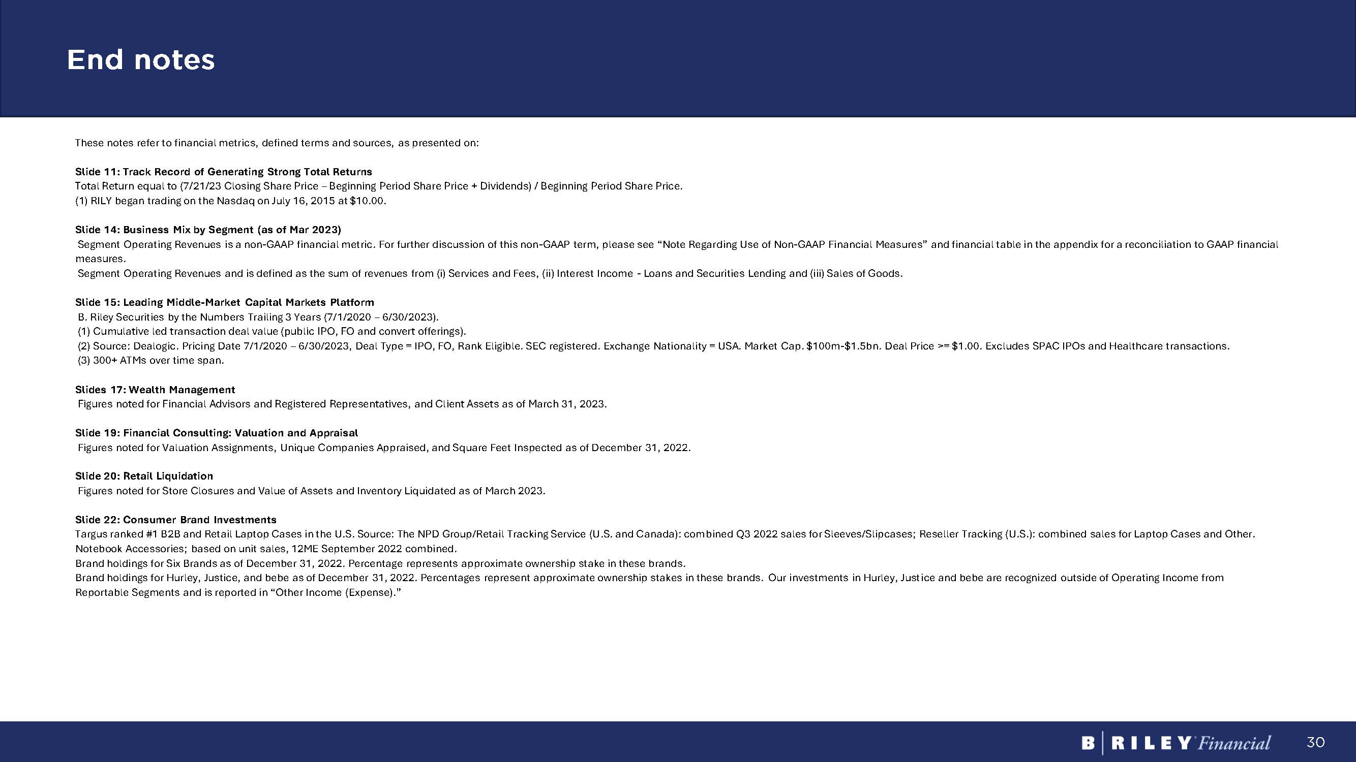 30 End notes These notes refer to financial metrics, defined terms and sources, as presented on: Slide 11: Track Record of Generating Strong Total Returns Total Return equal to (7/21/23 Closing Share Price – Beginning Period Share Price + Dividends) / Beginning Period Share Price. (1) RILY began trading on the Nasdaq on July 16, 2015 at $10.00. Slide 14: Business Mix by Segment (as of Mar 2023) Segment Operating Revenues is a non - GAAP financial metric. For further discussion of this non - GAAP term, please see “Note Regar ding Use of Non - GAAP Financial Measures” and financial table in the appendix for a reconciliation to GAAP financial measures. Segment Operating Revenues and is defined as the sum of revenues from (i) Services and Fees, (ii) Interest Income - Loans and S ecurities Lending and (iii) Sales of Goods. Slide 15: Leading Middle - Market Capital Markets Platform B. Riley Securities by the Numbers Trailing 3 Years (7/1/2020 – 6/30/2023). (1) Cumulative led transaction deal value (public IPO, FO and convert offerings). (2) Source: Dealogic. Pricing Date 7/1/2020 – 6/30/2023, Deal Type = IPO, FO, Rank Eligible. SEC registered. Exchange Nationali ty = USA. Market Cap. $100m - $1.5bn. Deal Price >= $1.00. Excludes SPAC IPOs and Healthcare transactions. (3) 300+ ATMs over time span. Slides 17 : Wealth Management Figures noted for Financial Advisors and Registered Representatives, and Client Assets as of March 31, 2023. Slide 19: Financial Consulting: Valuation and Appraisal Figures noted for Valuation Assignments, Unique Companies Appraised, and Square Feet Inspected as of December 31, 2022. Slide 20: Retail Liquidation Figures noted for Store Closures and Value of Assets and Inventory Liquidated as of March 2023. Slide 22: Consumer Brand Investments Targus ranked #1 B2B and Retail Laptop Cases in the U.S. Source: The NPD Group/Retail Tracking Service (U.S. and Canada): com bin ed Q3 2022 sales for Sleeves/Slipcases; Reseller Tracking (U.S.): combined sales for Laptop Cases and Other. Notebook Accessories; based on unit sales, 12ME September 2022 combined. Brand holdings for Six Brands as of December 31, 2022. Percentage represents approximate ownership stake in these brands. Brand holdings for Hurley, Justice, and bebe as of December 31, 2022. Percentages represent approximate ownership stakes in these brands. Our investments in Hurley, Just ic e and bebe are recognized outside of Operating Income from Reportable Segments and is reported in “Other Income (Expense).”