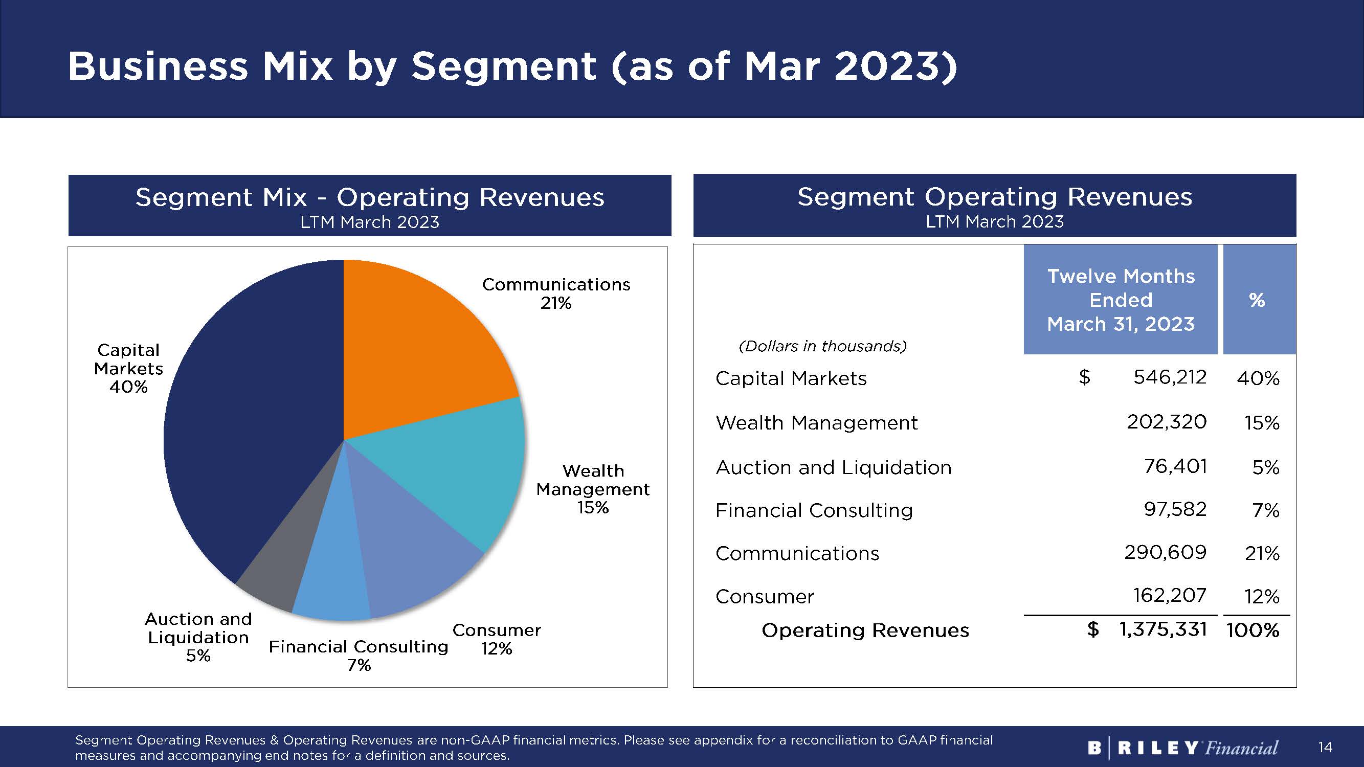 14 Business Mix by Segment (as of Mar 2023) Capital Markets 40% Communications 21% Wealth Management 15% Consumer 12% Financial Consulting 7% Auction and Liquidation 5% Segment Operating Revenues LTM March 2023 Segment Mix - Operating Revenues LTM March 2023 (Dollars in thousands) Twelve Months Ended March 31, 2023 % Capital Markets $ 546,212 40% Wealth Management 202,320 15% Auction and Liquidation 76,401 5% Financial Consulting 97,582 7% Communications 290,609 21% Consumer 162,207 12% Operating Revenues $ 1,375,331 100% Segment Operating Revenues & Operating Revenues are non - GAAP financial metrics. Please see appendix for a reconciliation to GAAP financial measures and accompanying end notes for a definition and sources.