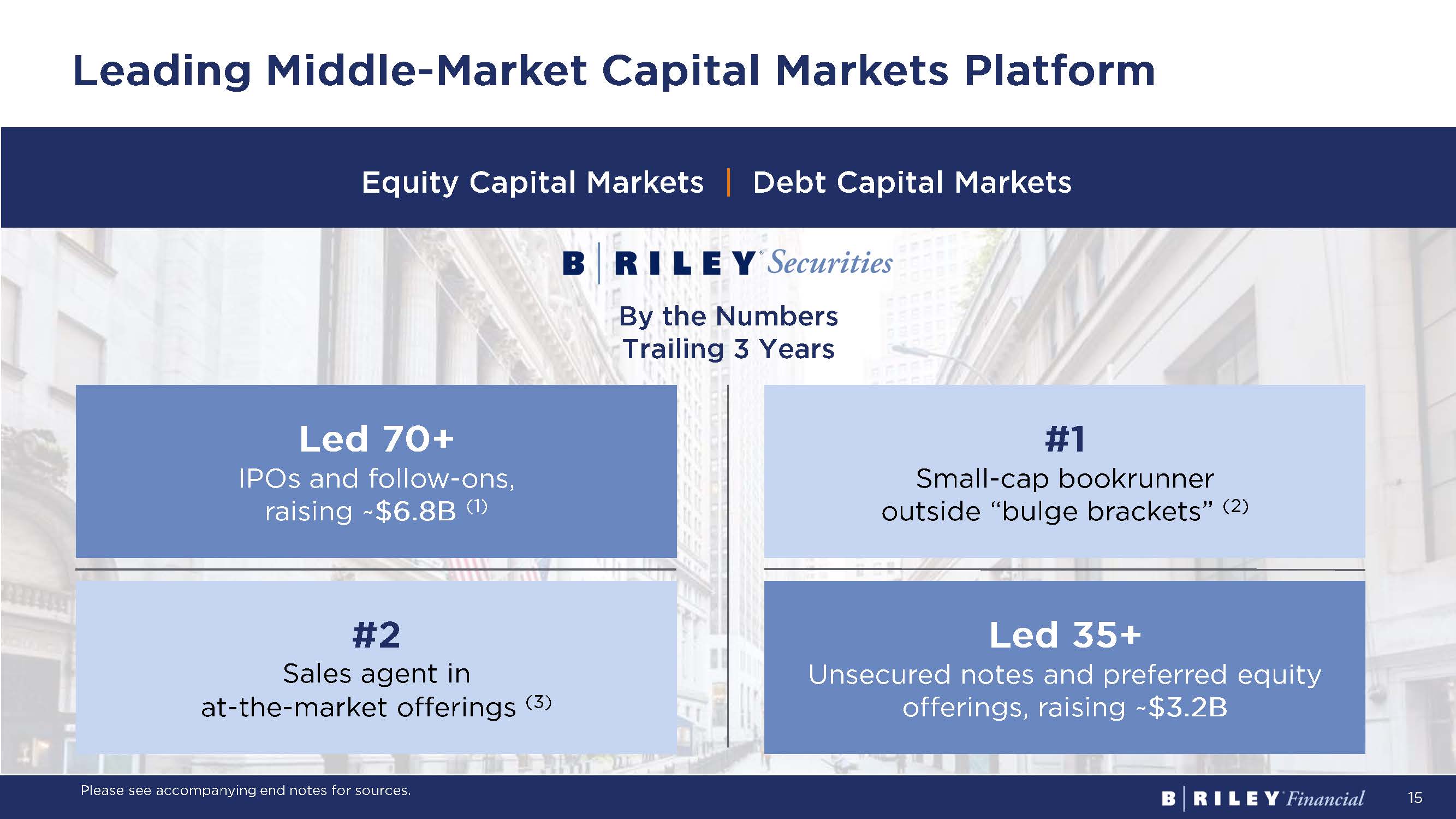 15 Equity Capital Markets | Debt Capital Markets By the Numbers Trailing 3 Years #2 Sales agent in at - the - market offerings (3) Led 35+ Unsecured notes and preferred equity offerings, raising ~ $3.2B Led 70+ IPOs and follow - ons, raising ~ $6.8B (1) #1 Small - cap bookrunner outside “bulge brackets” (2) Leading Middle - Market Capital Markets Platform Please see accompanying end notes for sources.