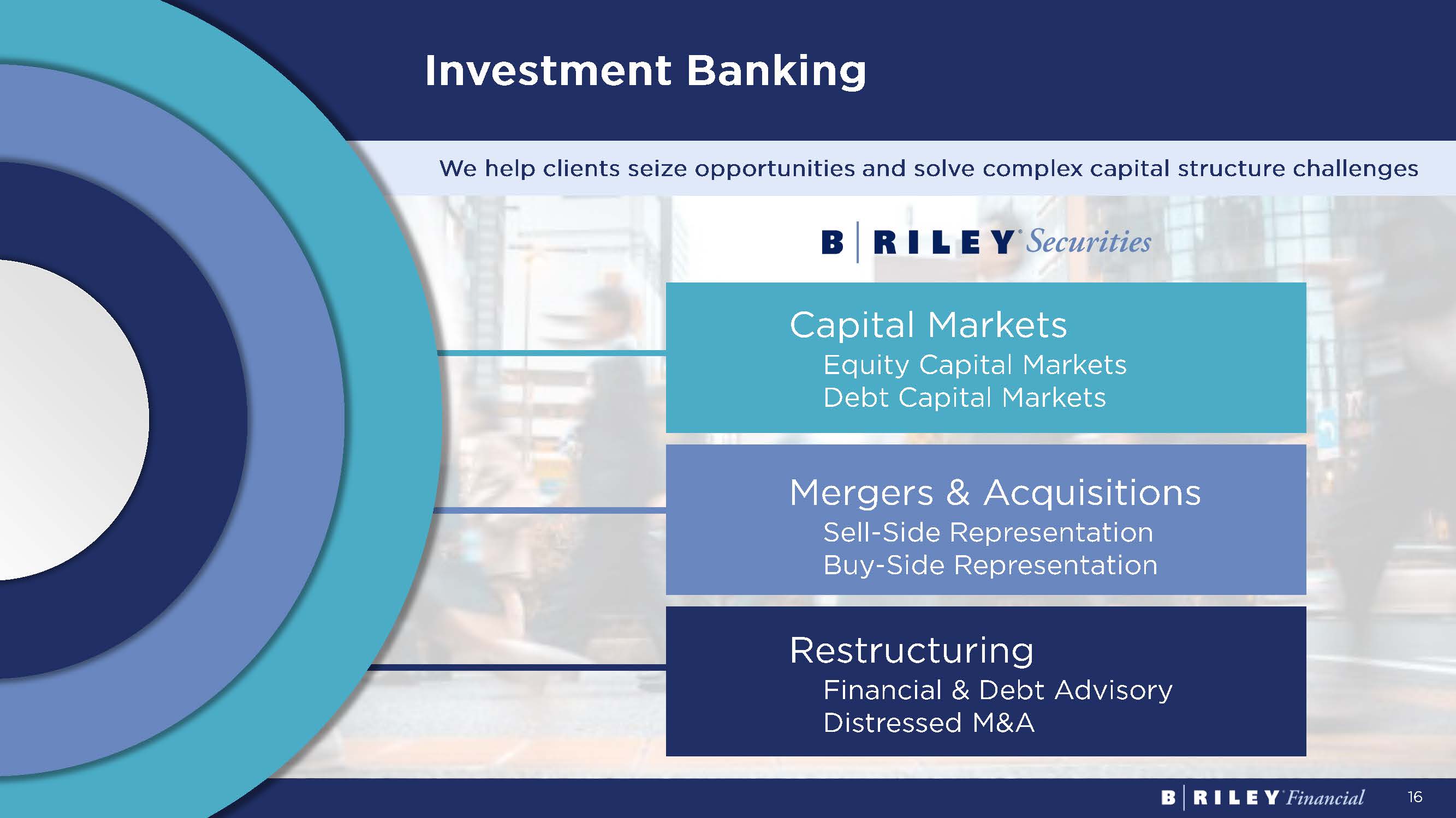 16 Capital Markets Equity Capital Markets Debt Capital Markets Mergers & Acquisitions We help clients seize opportunities and solve complex capital structure challenges Sell - Side Representation Buy - Side Representation Restructuring Financial & Debt Advisory Distressed M&A Investment Banking