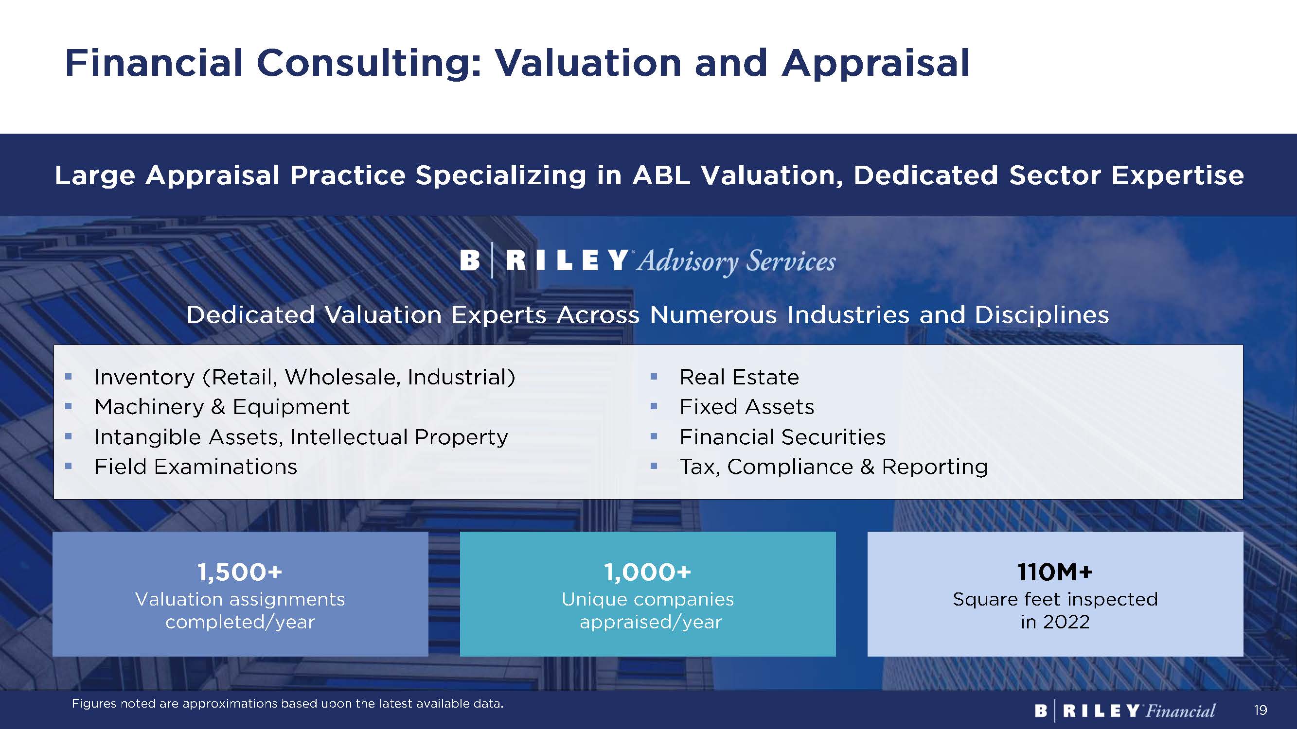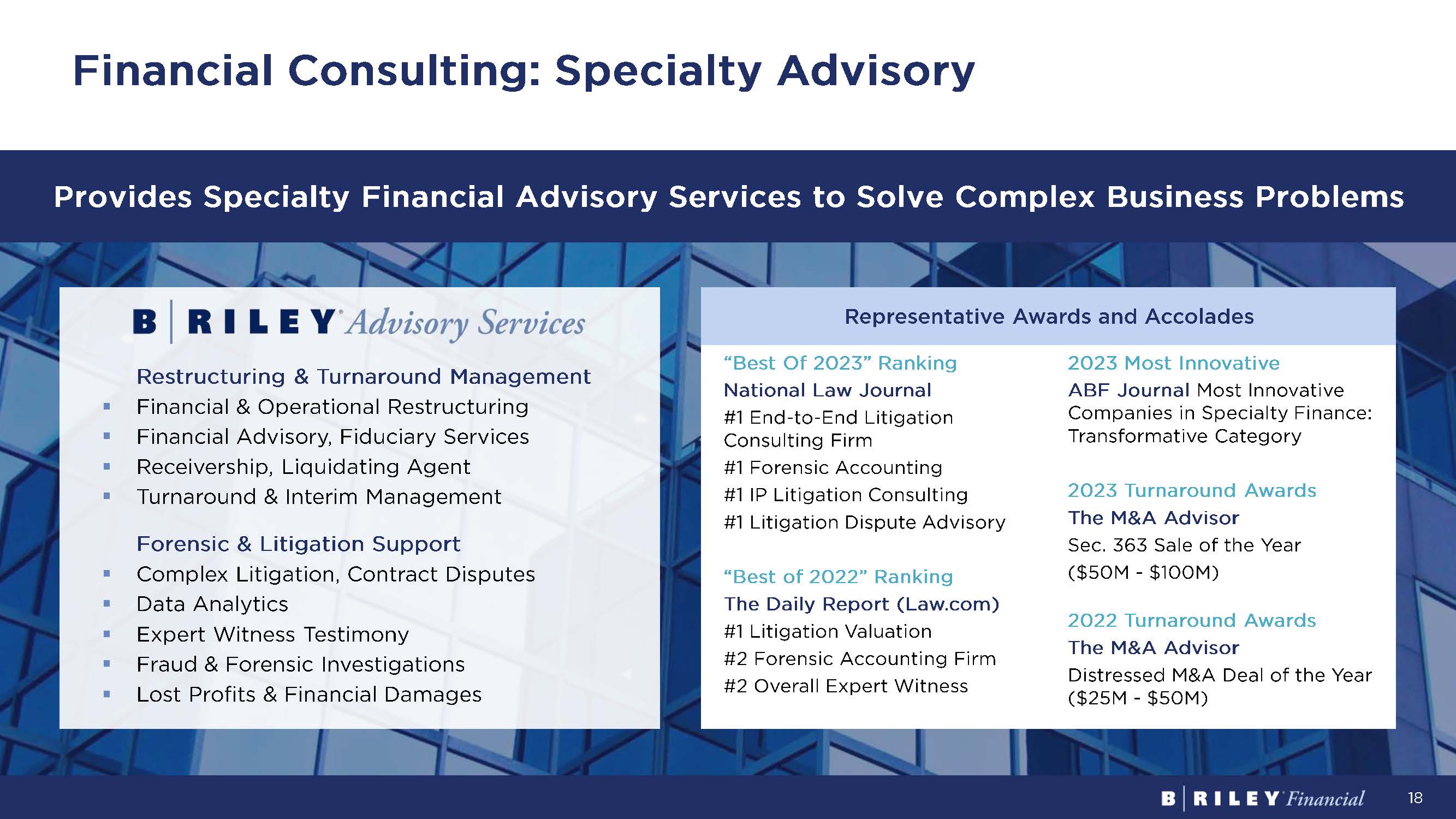 18 Financial Consulting “Best Of 2023” Ranking National Law Journal #1 End - to - End Litigation Consulting Firm #1 Forensic Accounting #1 IP Litigation Consulting #1 Litigation Dispute Advisory “Best of 2022” Ranking The Daily Report (Law.com) #1 Litigation Valuation #2 Forensic Accounting Firm #2 Overall Expert Witness 2023 Most Innovative ABF Journal Most Innovative Companies in Specialty Finance: Transformative Category 2023 Turnaround Awards The M&A Advisor Sec. 363 Sale of the Year ($50M - $100M) 2022 Turnaround Awards The M&A Advisor Distressed M&A Deal of the Year ($25M - $50M) Representative Awards and Accolades Financial Consulting: Specialty Advisory Restructuring & Turnaround Management ▪ Financial & Operational Restructuring ▪ Financial Advisory, Fiduciary Services ▪ Receivership , Liquidating Agent ▪ Turnaround & Interim Management Forensic & Litigation Support ▪ Complex Litigation, Contract Disputes ▪ Data Analytics ▪ Expert Witness Testimony ▪ Fraud & Forensic Investigations ▪ Lost Profits & Financial Damages Provides Specialty Financial Advisory Services to Solve Complex Business Problems