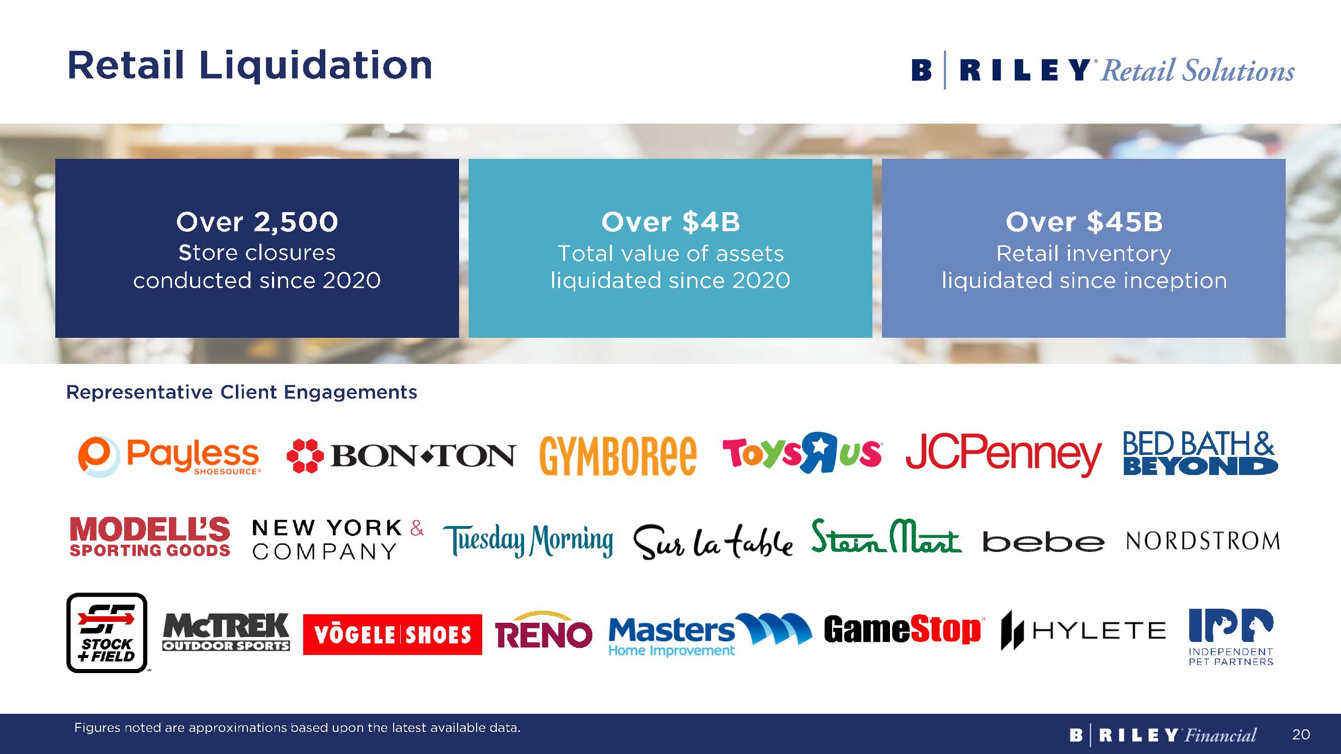 19 Retail Liquidation Financial Consulting: Valuation and Appraisal 1,000+ Unique companies a ppraised/year 1,500+ Valuation assignments completed/year 110M+ Square feet inspected in 2022 ▪ Inventory (Retail, Wholesale, Industrial) ▪ Machinery & Equipment ▪ Intangible Assets, Intellectual Property ▪ Field Examinations ▪ Real Estate ▪ Fixed Assets ▪ Financial Securities ▪ Tax, Compliance & Reporting Dedicated Valuation Experts Across Numerous Industries and Disciplines Large Appraisal Practice Specializing in ABL Valuation, Dedicated Sector Expertise Figures noted are approximations based upon the latest available data.