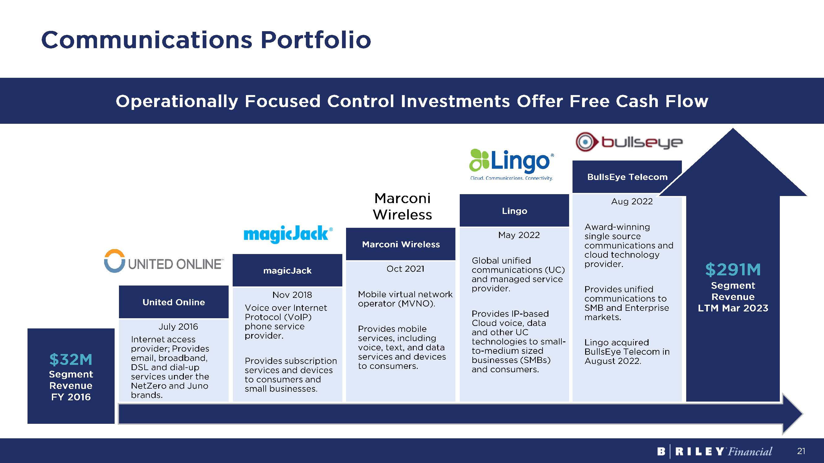 21 Communications Portfolio Marconi Wireless magicJack United Online July 2016 Internet access provider; Provides email, broadband, DSL and dial - up services under the NetZero and Juno brands. Nov 2018 Voice over Internet Protocol (VoIP) phone service provider. Provides subscription services and devices to consumers and small businesses. Oct 2021 Mobile virtual network operator (MVNO ). Provides mobile services, including voice, text, and data services and devices to consumers. Aug 2022 A ward - winning single source communications and cloud technology provider. Provides unified communications to SMB and Enterprise markets. Lingo acquired BullsEye Telecom in August 2022. $32M Segment Revenue FY 2016 Lingo May 2022 Global unified communications (UC) and managed service provider. Provides IP - based Cloud voice, data and other UC technologies to small - to - medium sized businesses (SMBs) and consumers. BullsEye Telecom $291M Segment Revenue LTM Mar 2023 Operationally Focused Control Investments Offer Free Cash Flow Marconi Wireless