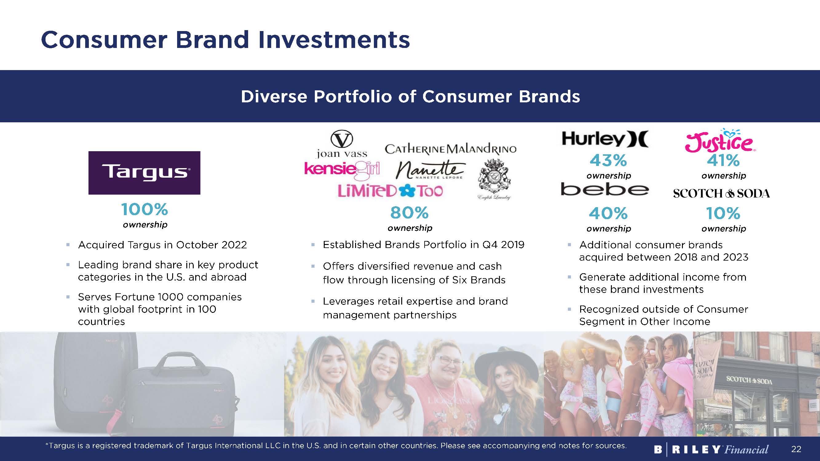 22 Consumer Brand Investments Diverse Portfolio of Consumer Brands ▪ Acquired Targus in October 2022 ▪ Leading brand share in key product categories in the U.S. and abroad ▪ Serves Fortune 1000 companies with global footprint in 100 countries *Targus is a registered trademark of Targus International LLC in the U.S. and in certain other countries. Please see accompan yin g end notes for sources. ▪ Established Brands Portfolio in Q4 2019 ▪ Offers diversified revenue and cash flow through licensing of Six Brands ▪ Leverages retail expertise and brand management partnerships ▪ Additional consumer brands acquired between 2018 and 2023 ▪ Generate additional income from these brand investments ▪ Recognized outside of Consumer Segment in Other Income 100% ownership 80% ownership 43% ownership 41% ownership 40% ownership 10% ownership