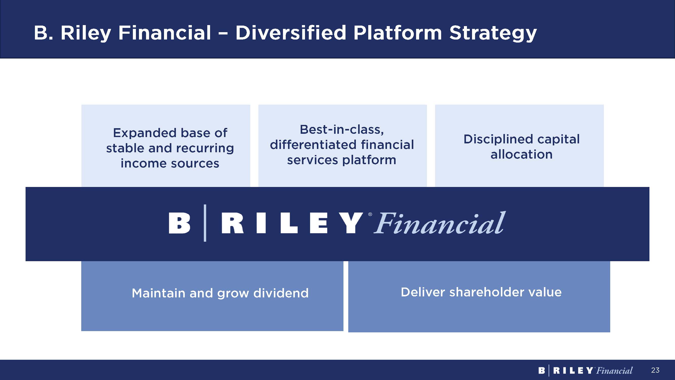 23 B. Riley Financial – Diversified Platform Strategy Expanded base of stable and recurring income sources Best - in - class, differentiated financial services platform Disciplined capital allocation Maintain and grow dividend Deliver shareholder value