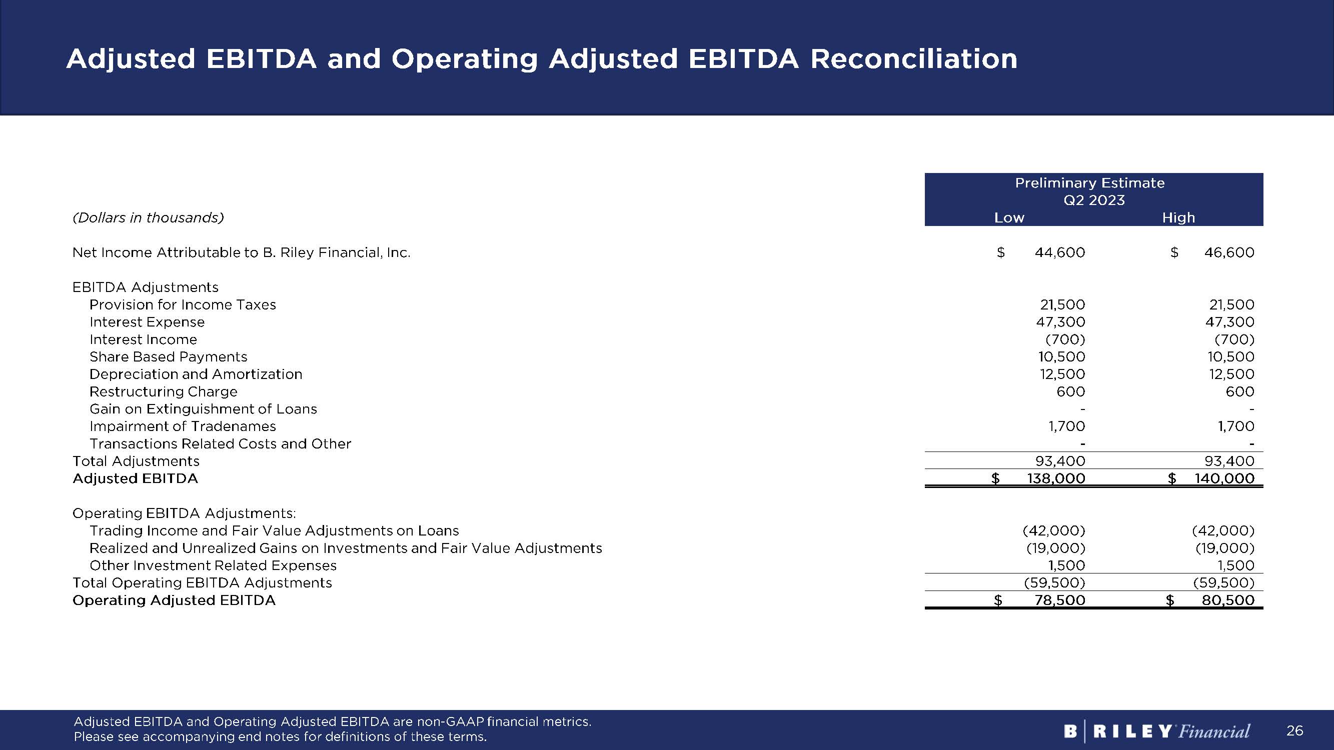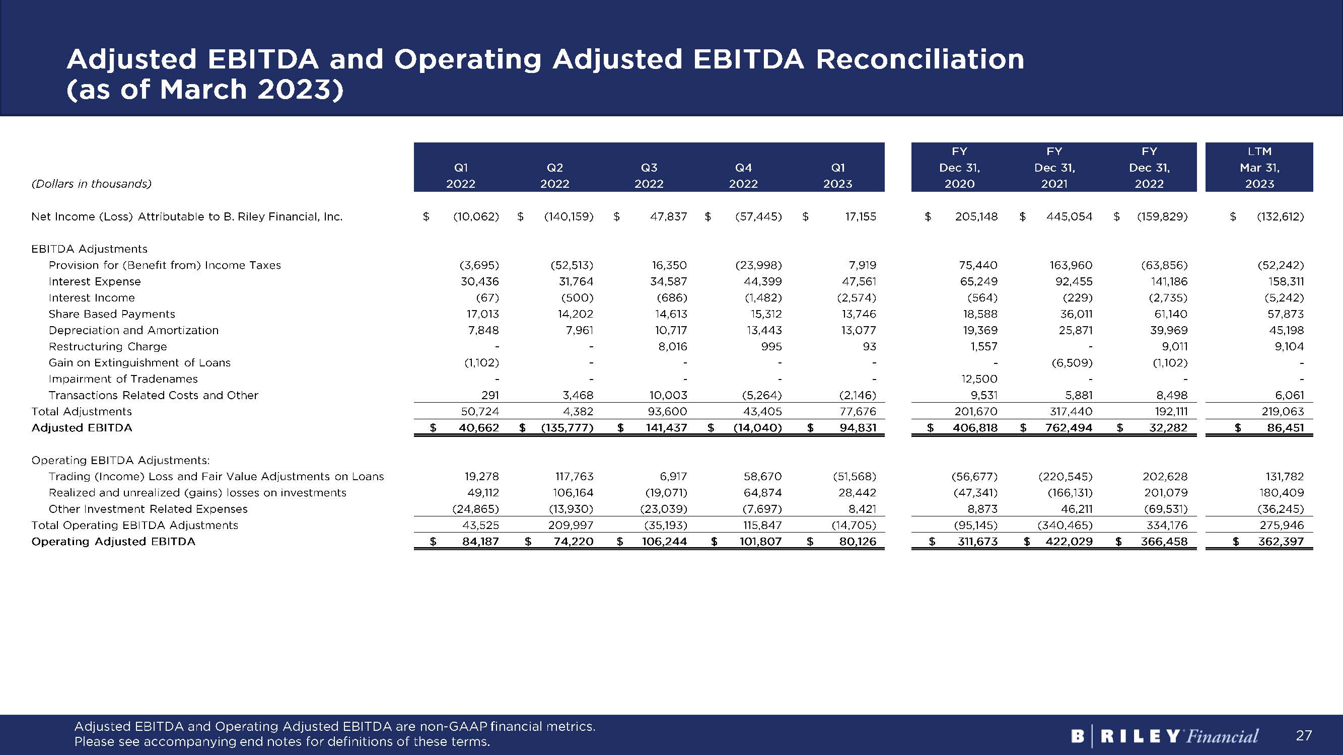 26 Adjusted EBITDA and Operating Adjusted EBITDA Reconciliation Preliminary Estimate Q2 2023 (Dollars in thousands) Low High Net Income Attributable to B. Riley Financial, Inc. $ 44,600 $ 46,600 EBITDA Adjustments Provision for Income Taxes 21,500 21,500 Interest Expense 47,300 47,300 Interest Income (700) (700) Share Based Payments 10,500 10,500 Depreciation and Amortization 12,500 12,500 Restructuring Charge 600 600 Gain on Extinguishment of Loans - - Impairment of Tradenames 1,700 1,700 Transactions Related Costs and Other - - Total Adjustments 93,400 93,400 Adjusted EBITDA $ 138,000 $ 140,000 Operating EBITDA Adjustments: Trading Income and Fair Value Adjustments on Loans (42,000) (42,000) Realized and Unrealized Gains on Investments and Fair Value Adjustments (19,000) (19,000) Other Investment Related Expenses 1,500 1,500 Total Operating EBITDA Adjustments (59,500) (59,500) Operating Adjusted EBITDA $ 78,500 $ 80,500 Adjusted EBITDA and Operating Adjusted EBITDA are non - GAAP financial metrics. Please see accompanying end notes for definitions of these terms.