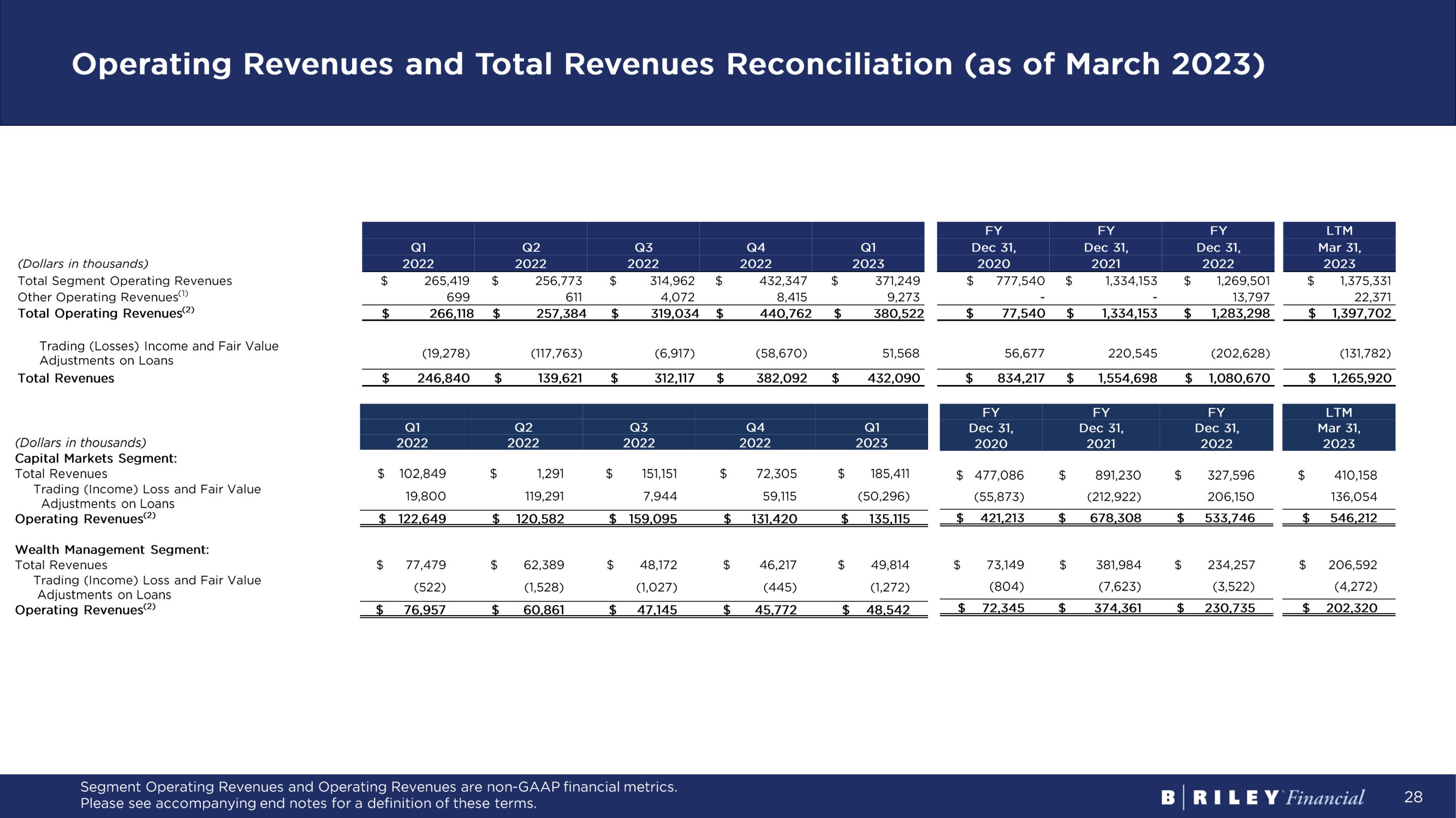 27 Adjusted EBITDA and Operating Adjusted EBITDA Reconciliation (as of March 2023) Adjusted EBITDA and Operating Adjusted EBITDA are non - GAAP financial metrics. Please see accompanying end notes for definitions of these terms. Q1 Q2 Q3 Q4 Q1 (Dollars in thousands) 2022 2022 2022 2022 2023 Net Income (Loss) Attributable to B. Riley Financial, Inc. $ (10,062) $ (140,159) $ 47,837 $ (57,445) $ 17,155 EBITDA Adjustments Provision for (Benefit from) Income Taxes (3,695) (52,513) 16,350 (23,998) 7,919 Interest Expense 30,436 31,764 34,587 44,399 47,561 Interest Income (67) (500) (686) (1,482) (2,574) Share Based Payments 17,013 14,202 14,613 15,312 13,746 Depreciation and Amortization 7,848 7,961 10,717 13,443 13,077 Restructuring Charge - - 8,016 995 93 Gain on Extinguishment of Loans (1,102) - - - - Impairment of Tradenames - - - - - Transactions Related Costs and Other 291 3,468 10,003 (5,264) (2,146) Total Adjustments 50,724 4,382 93,600 43,405 77,676 Adjusted EBITDA $ 40,662 $ (135,777) $ 141,437 $ (14,040) $ 94,831 Operating EBITDA Adjustments: Trading (Income) Loss and Fair Value Adjustments on Loans 19,278 117,763 6,917 58,670 (51,568) Realized and unrealized (gains) losses on investments 49,112 106,164 (19,071) 64,874 28,442 Other Investment Related Expenses (24,865) (13,930) (23,039) (7,697) 8,421 Total Operating EBITDA Adjustments 43,525 209,997 (35,193) 115,847 (14,705) Operating Adjusted EBITDA $ 84,187 $ 74,220 $ 106,244 $ 101,807 $ 80,126 FY FY FY LTM Dec 31, Dec 31, Dec 31, Mar 31, 2020 2021 2022 2023 $ 205,148 $ 445,054 $ (159,829) $ (132,612) 75,440 163,960 (63,856) (52,242) 65,249 92,455 141,186 158,311 (564) (229) (2,735) (5,242) 18,588 36,011 61,140 57,873 19,369 25,871 39,969 45,198 1,557 - 9,011 9,104 - (6,509) (1,102) - 12,500 - - - 9,531 5,881 8,498 6,061 201,670 317,440 192,111 219,063 $ 406,818 $ 762,494 $ 32,282 $ 86,451 (56,677) (220,545) 202,628 131,782 (47,341) (166,131) 201,079 180,409 8,873 46,211 (69,531) (36,245) (95,145) (340,465) 334,176 275,946 $ 311,673 $ 422,029 $ 366,458 $ 362,397