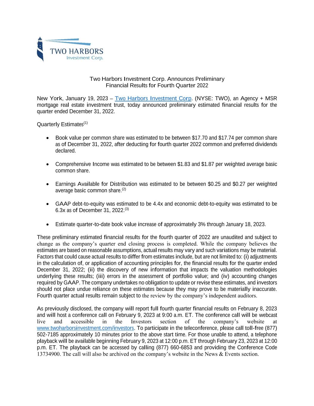 Two Harbors Investment Corp. Announces Preliminary Financial Results for Fourth Quarter 2022 New York, January 19, 2023 – Two Harbors Investment Corp. (NYSE: TWO), an Agency + MSR mortgage real estate investment trust, today announced preliminary estimated financial results for the quarter ended December 31, 2022. Quarterly Estimates(1) • Book value per common share was estimated to be between $17.70 and $17.74 per common share as of December 31, 2022, after deducting for fourth quarter 2022 common and preferred dividends declared. • Comprehensive Income was estimated to be between $1.83 and $1.87 per weighted average basic common share. • Earnings Available for Distribution was estimated to be between $0.25 and $0.27 per weighted average basic common share.(2) • GAAP debt-to-equity was estimated to be 4.4x and economic debt-to-equity was estimated to be 6.3x as of December 31, 2022.(3) • Estimate quarter-to-date book value increase of approximately 3% through January 18, 2023. These preliminary estimated financial results for the fourth quarter of 2022 are unaudited and subject to change as the company’s quarter end closing process is completed. While the company believes the estimates are based on reasonable assumptions, actual results may vary and such variations may be material. Factors that could cause actual results to differ from estimates include, but are not limited to: (i) adjustments in the calculation of, or application of accounting principles for, the financial results for the quarter ended December 31, 2022; (ii) the discovery of new information that impacts the valuation methodologies underlying these results; (iii) errors in the assessment of portfolio value; and (iv) accounting changes required by GAAP. The company undertakes no obligation to update or revise these estimates, and investors should not place undue reliance on these estimates because they may prove to be materially inaccurate. Fourth quarter actual results remain subject to the review by the company’s independent auditors. As previously disclosed, the company will report full fourth quarter financial results on February 8, 2023 and will host a conference call on February 9, 2023 at 9:00 a.m. ET. The conference call will be webcast live and accessible in the Investors section of the company’s website at www.twoharborsinvestment.com/investors. To participate in the teleconference, please call toll-free (877) 502-7185 approximately 10 minutes prior to the above start time. For those unable to attend, a telephone playback will be available beginning February 9, 2023 at 12:00 p.m. ET through February 23, 2023 at 12:00 p.m. ET. The playback can be accessed by calling (877) 660-6853 and providing the Conference Code 13734900. The call will also be archived on the company’s website in the News & Events section.