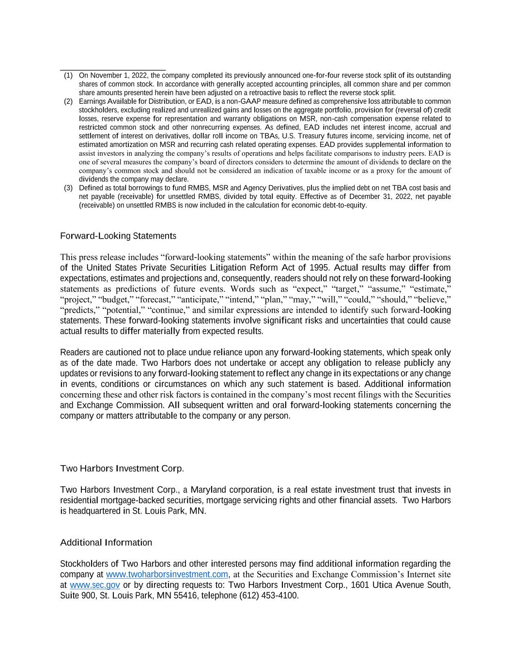 _______________________ (1) On November 1, 2022, the company completed its previously announced one-for-four reverse stock split of its outstanding shares of common stock. In accordance with generally accepted accounting principles, all common share and per common share amounts presented herein have been adjusted on a retroactive basis to reflect the reverse stock split. (2) Earnings Available for Distribution, or EAD, is a non-GAAP measure defined as comprehensive loss attributable to common stockholders, excluding realized and unrealized gains and losses on the aggregate portfolio, provision for (reversal of) credit losses, reserve expense for representation and warranty obligations on MSR, non-cash compensation expense related to restricted common stock and other nonrecurring expenses. As defined, EAD includes net interest income, accrual and settlement of interest on derivatives, dollar roll income on TBAs, U.S. Treasury futures income, servicing income, net of estimated amortization on MSR and recurring cash related operating expenses. EAD provides supplemental information to assist investors in analyzing the company’s results of operations and helps facilitate comparisons to industry peers. EAD is one of several measures the company’s board of directors considers to determine the amount of dividends to declare on the company’s common stock and should not be considered an indication of taxable income or as a proxy for the amount of dividends the company may declare. (3) Defined as total borrowings to fund RMBS, MSR and Agency Derivatives, plus the implied debt on net TBA cost basis and net payable (receivable) for unsettled RMBS, divided by total equity. Effective as of December 31, 2022, net payable (receivable) on unsettled RMBS is now included in the calculation for economic debt-to-equity. Forward-Looking Statements This press release includes “forward-looking statements” within the meaning of the safe harbor provisions of the United States Private Securities Litigation Reform Act of 1995. Actual results may differ from expectations, estimates and projections and, consequently, readers should not rely on these forward-looking statements as predictions of future events. Words such as “expect,” “target,” “assume,” “estimate,” “project,” “budget,” “forecast,” “anticipate,” “intend,” “plan,” “may,” “will,” “could,” “should,” “believe,” “predicts,” “potential,” “continue,” and similar expressions are intended to identify such forward-looking statements. These forward-looking statements involve significant risks and uncertainties that could cause actual results to differ materially from expected results. Readers are cautioned not to place undue reliance upon any forward-looking statements, which speak only as of the date made. Two Harbors does not undertake or accept any obligation to release publicly any updates or revisions to any forward-looking statement to reflect any change in its expectations or any change in events, conditions or circumstances on which any such statement is based. Additional information concerning these and other risk factors is contained in the company’s most recent filings with the Securities and Exchange Commission. All subsequent written and oral forward-looking statements concerning the company or matters attributable to the company or any person. Two Harbors Investment Corp. Two Harbors Investment Corp., a Maryland corporation, is a real estate investment trust that invests in residential mortgage-backed securities, mortgage servicing rights and other financial assets. Two Harbors is headquartered in St. Louis Park, MN. Additional Information Stockholders of Two Harbors and other interested persons may find additional information regarding the company at www.twoharborsinvestment.com, at the Securities and Exchange Commission’s Internet site at www.sec.gov or by directing requests to: Two Harbors Investment Corp., 1601 Utica Avenue South, Suite 900, St. Louis Park, MN 55416, telephone (612) 453-4100.