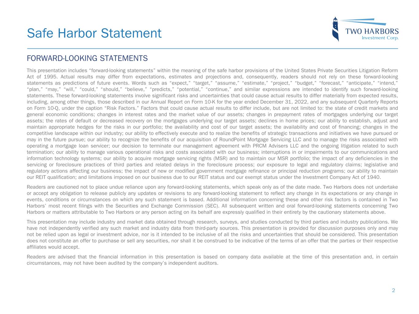 Safe Harbor Statement 2 FORWARD-LOOKING STATEMENTS This presentation includes “forward-looking statements” within the meaning of the safe harbor provisions of the United States Private Securities Litigation Reform Act of 1995. Actual results may differ from expectations, estimates and projections and, consequently, readers should not rely on these forward-looking statements as predictions of future events. Words such as “expect,” “target,” “assume,” “estimate,” “project,” “budget,” “forecast,” “anticipate,” “intend,” “plan,” “may,” “will,” “could,” “should,” “believe,” “predicts,” “potential,” “continue,” and similar expressions are intended to identify such forward-looking statements. These forward-looking statements involve significant risks and uncertainties that could cause actual results to differ materially from expected results, including, among other things, those described in our Annual Report on Form 10-K for the year ended December 31, 2022, and any subsequent Quarterly Reports on Form 10-Q, under the caption “Risk Factors.” Factors that could cause actual results to differ include, but are not limited to: the state of credit markets and general economic conditions; changes in interest rates and the market value of our assets; changes in prepayment rates of mortgages underlying our target assets; the rates of default or decreased recovery on the mortgages underlying our target assets; declines in home prices; our ability to establish, adjust and maintain appropriate hedges for the risks in our portfolio; the availability and cost of our target assets; the availability and cost of financing; changes in the competitive landscape within our industry; our ability to effectively execute and to realize the benefits of strategic transactions and initiatives we have pursued or may in the future pursue; our ability to recognize the benefits of our acquisition of RoundPoint Mortgage Servicing LLC and to manage the risks associated with operating a mortgage loan servicer; our decision to terminate our management agreement with PRCM Advisers LLC and the ongoing litigation related to such termination; our ability to manage various operational risks and costs associated with our business; interruptions in or impairments to our communications and information technology systems; our ability to acquire mortgage servicing rights (MSR) and to maintain our MSR portfolio; the impact of any deficiencies in the servicing or foreclosure practices of third parties and related delays in the foreclosure process; our exposure to legal and regulatory claims; legislative and regulatory actions affecting our business; the impact of new or modified government mortgage refinance or principal reduction programs; our ability to maintain our REIT qualification; and limitations imposed on our business due to our REIT status and our exempt status under the Investment Company Act of 1940. Readers are cautioned not to place undue reliance upon any forward-looking statements, which speak only as of the date made. Two Harbors does not undertake or accept any obligation to release publicly any updates or revisions to any forward-looking statement to reflect any change in its expectations or any change in events, conditions or circumstances on which any such statement is based. Additional information concerning these and other risk factors is contained in Two Harbors’ most recent filings with the Securities and Exchange Commission (SEC). All subsequent written and oral forward-looking statements concerning Two Harbors or matters attributable to Two Harbors or any person acting on its behalf are expressly qualified in their entirety by the cautionary statements above. This presentation may include industry and market data obtained through research, surveys, and studies conducted by third parties and industry publications. We have not independently verified any such market and industry data from third-party sources. This presentation is provided for discussion purposes only and may not be relied upon as legal or investment advice, nor is it intended to be inclusive of all the risks and uncertainties that should be considered. This presentation does not constitute an offer to purchase or sell any securities, nor shall it be construed to be indicative of the terms of an offer that the parties or their respective affiliates would accept. Readers are advised that the financial information in this presentation is based on company data available at the time of this presentation and, in certain circumstances, may not have been audited by the company’s independent auditors.