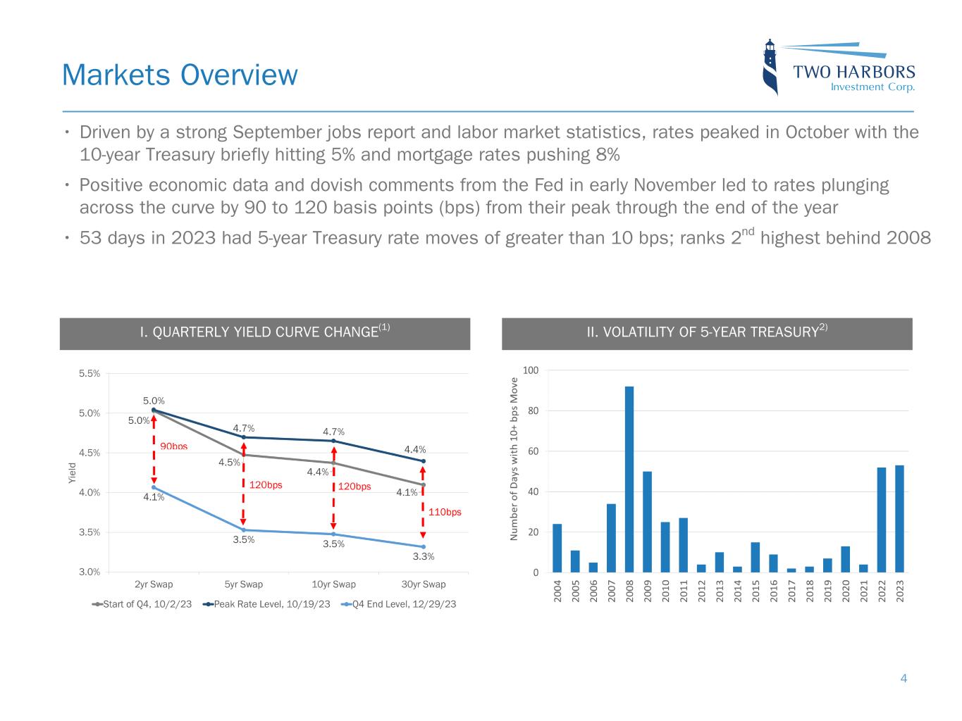 Financials Overview 3 Book Value per Share $15.21 Common Stock Dividend $0.45 Economic Return on Book Value(1) 2.0% Comprehensive Income $0.40 Investment Portfolio(3) $14.6b Quarter-End Economic Debt-to-Equity(4) 6.0x Note: Financial data throughout this presentation is as of or for the quarter ended December 31, 2023, unless otherwise noted. Per share metrics utilize basic common shares as the denominator. The End Notes are an integral part of this presentation. See slides 31 through 37 at the back of this presentation for information related to certain financial metrics and defined terms used herein. Income Excluding Market-Driven Value Changes (IXM)(2) $0.39