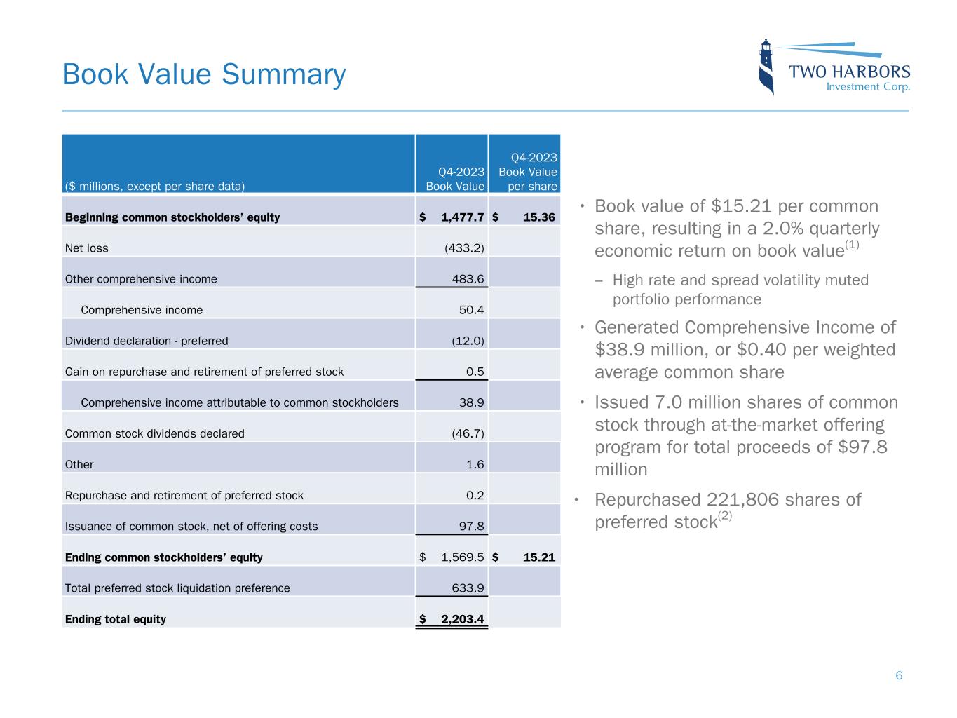 $160.2 $(63.2) $31.5 $(56.8) $38.9 Comprehensive Income ($ in millions) Q4-2022 Q1-2023 Q2-2023 Q3-2023 Q4-2023 $-300 $-150 $0 $150 $300 $17.72 $16.48 $16.39 $15.36 $15.21 $0.60 $0.60 $0.45 $0.45 $0.45 Book Value ($) Dividend Declared ($) Q4-2022 Q1-2023 Q2-2023 Q3-2023 Q4-2023 $5.00 $10.00 $15.00 $20.00 $25.00 $30.00 DIVIDEND YIELD(2) Financial Performance COMPREHENSIVE INCOME (LOSS) QUARTERLY ECONOMIC RETURN ON BOOK VALUE(1) BOOK VALUE AND DIVIDEND PER COMMON SHARE(2) 11.6% (3.6)% 2.2% (3.5)% 2.0% Quarterly Return on Book Value Q4-2022 Q1-2023 Q2-2023 Q3-2023 Q4-2023 -20% -10% 0% 10% 20% 15.2% 16.3% 13.0% 13.6% 12.9% Dividend Yield Q4-2022 Q1-2023 Q2-2023 Q3-2023 Q4-2023 5% 10% 15% 20% 25% 18