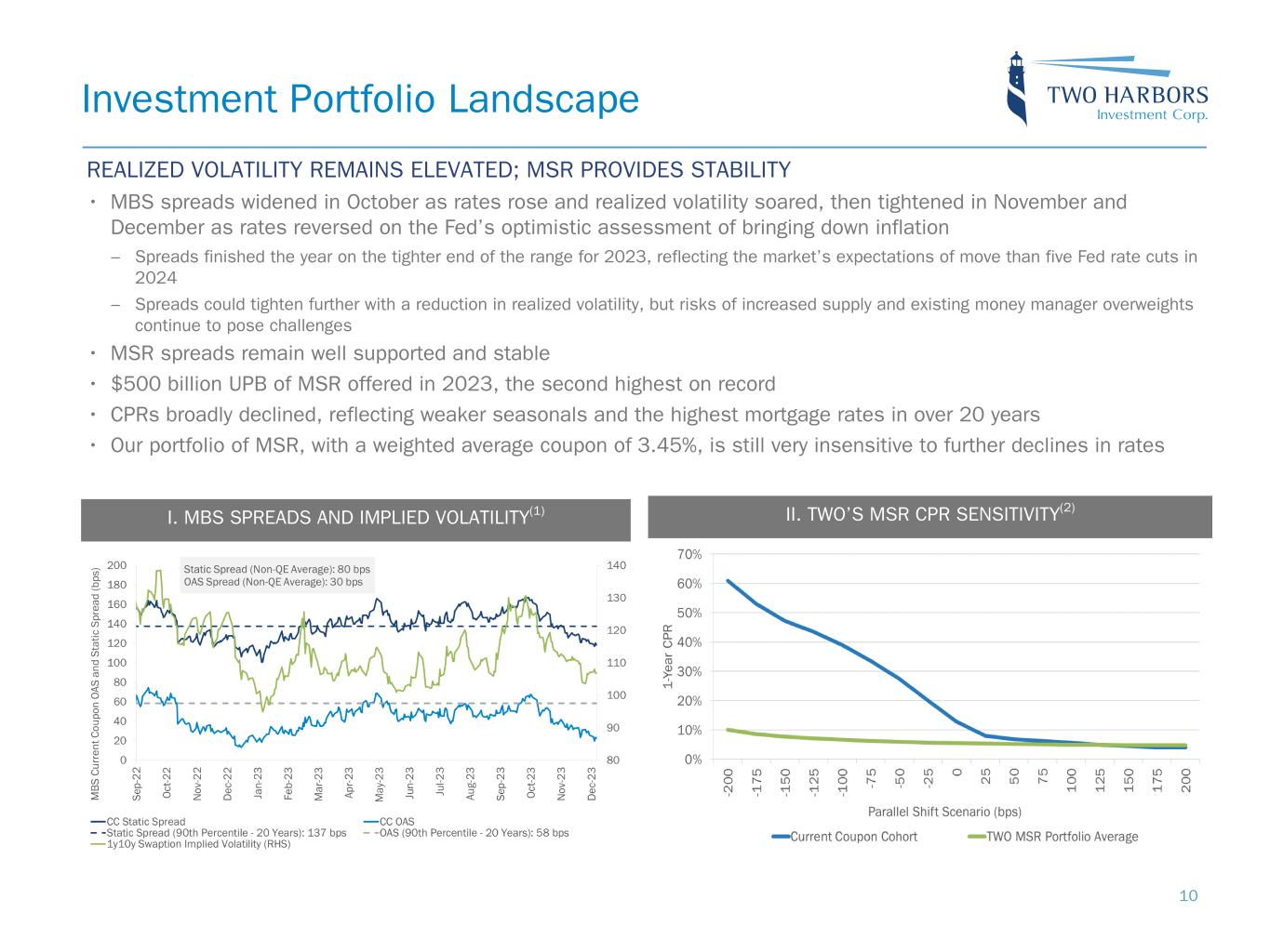 • $1.6 billion of outstanding borrowings under bilateral MSR asset financing facilities • $296 million of outstanding 5-year MSR term notes(2) • $591 million of unused MSR asset financing capacity; $168 million committed and $423 million uncommitted • $34 million outstanding borrowings and $166 million of unused, committed capacity for servicing advance receivables Strong Balance Sheet and Liquidity Position 9 MORTGAGE SERVICING RIGHTS AGENCY RMBSBALANCE SHEET AS OF DECEMBER 31, 2023 • $7.7 billion of outstanding repurchase agreements with 18 counterparties • Weighted average days to maturity of 48 days Av er ag e R ep o R at e - S O FR ( bp s) 3-month 6-month Q4 Q1 Q2 Q3 Q4 Q1 Q2 Q3 Q4 Q1 Q2 Q3 Q4 Q1 Q2 Q3 Q4 0 25 50 2019 (1 ) Agency RMBS $8.3 billion MSR $3.1 billion Cash & cash equivalents $0.7 billion All other assets $1.0 billion Agency RMBS repurchase agreements $7.7 billion MSR financing $1.9 billion All other liabilities $1.0 billion Preferred equity $0.6 billion Common equity $1.6 billion Convertible debt $0.3 billion 2020 2021 2022 2023