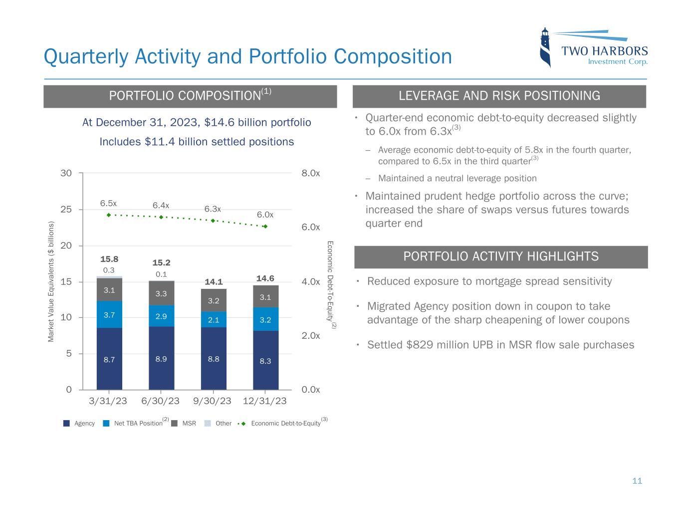 Quarterly Activity and Portfolio Composition At December 31, 2023, $14.6 billion portfolio Includes $11.4 billion settled positions PORTFOLIO COMPOSITION(1) LEVERAGE AND RISK POSITIONING M ar ke t Va lu e Eq ui va le nt s ($ b ill io ns ) Econom ic D ebt-To-Equity 8.7 8.9 8.8 8.3 3.7 2.9 2.1 3.2 3.1 3.3 3.2 3.1 6.5x 6.4x 6.3x 6.0x Agency Net TBA Position MSR Other Economic Debt-to-Equity 3/31/23 6/30/23 9/30/23 12/31/23 0 5 10 15 20 25 30 0.0x 2.0x 4.0x 6.0x 8.0x (3) (2 ) (2) • Quarter-end economic debt-to-equity decreased slightly to 6.0x from 6.3x(3) – Average economic debt-to-equity of 5.8x in the fourth quarter, compared to 6.5x in the third quarter(3) – Maintained a neutral leverage position • Maintained prudent hedge portfolio across the curve; increased the share of swaps versus futures towards quarter end • Reduced exposure to mortgage spread sensitivity • Migrated Agency position down in coupon to take advantage of the sharp cheapening of lower coupons • Settled $829 million UPB in MSR flow sale purchases PORTFOLIO ACTIVITY HIGHLIGHTS 14.6 14.1 15.8 15.2 0.3 0.1 11