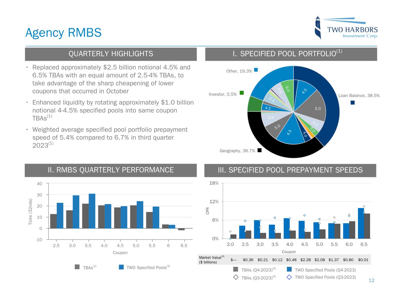 Loan Balance, 38.5% Geography, 36.7% Investor, 5.5% Other, 19.3% II. RMBS QUARTERLY PERFORMANCE Coupon Ti ck s (3 2 nd s) 2.5 3.0 3.5 4.0 4.5 5.0 5.5 6 6.5 -10 0 10 20 30 40 Agency RMBS I. SPECIFIED POOL PORTFOLIO(1) III. SPECIFIED POOL PREPAYMENT SPEEDS TWO Specified Pools(3)TBAs(2) TWO Specified Pools (Q4-2023)TBAs (Q4-2023)(5) TBAs (Q3-2023)(5) TWO Specified Pools (Q3-2023) Market Value(4) ($ billions) $— $0.36 $0.21 $0.12 $0.48 $2.28 $2.08 $1.37 $0.80 $0.01 QUARTERLY HIGHLIGHTS • Replaced approximately $2.5 billion notional 4.5% and 6.5% TBAs with an equal amount of 2.5-4% TBAs, to take advantage of the sharp cheapening of lower coupons that occurred in October • Enhanced liquidity by rotating approximately $1.0 billion notional 4-4.5% specified pools into same coupon TBAs(1) • Weighted average specified pool portfolio prepayment speed of 5.4% compared to 6.7% in third quarter 2023(1) 5.5 4. 5 5.0 4.04. 5 5.0 5.5 6.0 12 6.0 2.5 5.5 4.5