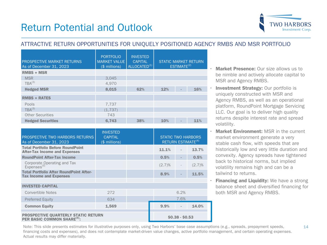 Note: Sensitivity data as of December 31, 2023. The above scenarios are provided for illustration purposes only and is not necessarily indicative of Two Harbors’ financial condition and operating results, nor are they necessarily indicative of the financial condition or results of operations that may be expected for any future period or date. Risk Positioning BOOK VALUE EXPOSURE TO CHANGES IN RATES % Change in Common Book Value 2-Year Rate (basis points) 10-Year Rate (basis points) Agency P&I RMBS/TBA MSR/Agency IO RMBS(1) Other(2) Combined -25 0 Bull Steepener(3) 2.2 % 1.4 % (3.0) % 0.6 % 0 -25 Bull Flattener(4) 7.5 % (3.9) % (4.5) % (0.9) % -50 -50 Parallel Shift(5) 19.0 % (5.1) % (15.1) % (1.2) % -25 -25 Parallel Shift(5) 9.7 % (2.5) % (7.5) % (0.3) % 0 0 Base — % — % — % — % +25 +25 Parallel Shift(5) (10.0) % 2.1 % 7.4 % (0.5) % +50 +50 Parallel Shift(5) (20.3) % 4.2 % 14.7 % (1.4) % +25 0 Bear Flattener(3) (2.1) % (1.2) % 2.9 % (0.4) % 0 +25 Bear Steepener(4) (7.9) % 3.4 % 4.5 % — % BOOK VALUE EXPOSURE TO CURRENT COUPON SPREAD(6) % Change in Common Book Value Parallel Shift in Spreads (basis points) Agency P&I RMBS/TBA MSR/Agency IO RMBS(1) Combined -25 7.9 % (2.5) % 5.4 % 0 — % — % — % +25 (8.3) % 2.0 % (6.3) % 17