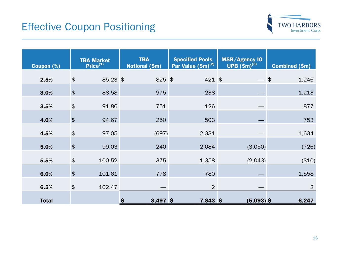 Effective Coupon Positioning Coupon (%) TBA Market Price(1) TBA Notional ($m) Specified Pools Par Value ($m)(2) MSR/Agency IO UPB ($m)(3) Combined ($m) 2.5% $ 85.23 $ 825 $ 421 $ — $ 1,246 3.0% $ 88.58 975 238 — 1,213 3.5% $ 91.86 751 126 — 877 4.0% $ 94.67 250 503 — 753 4.5% $ 97.05 (697) 2,331 — 1,634 5.0% $ 99.03 240 2,084 (3,050) (726) 5.5% $ 100.52 375 1,358 (2,043) (310) 6.0% $ 101.61 778 780 — 1,558 6.5% $ 102.47 — 2 — 2 Total $ 3,497 $ 7,843 $ (5,093) $ 6,247 16