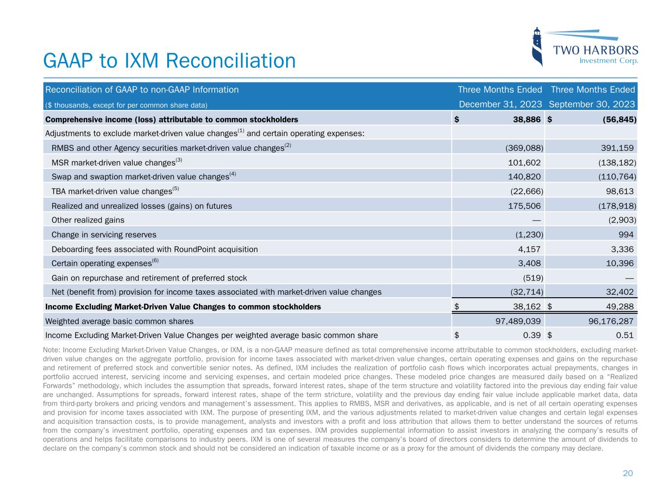 Note: Income Excluding Market-Driven Value Changes, or IXM, is a non-GAAP measure defined as total comprehensive income attributable to common stockholders, excluding market- driven value changes on the aggregate portfolio, provision for income taxes associated with market-driven value changes, certain operating expenses and gains on the repurchase and retirement of preferred stock and convertible senior notes. As defined, IXM includes the realization of portfolio cash flows which incorporates actual prepayments, changes in portfolio accrued interest, servicing income and servicing expenses, and certain modeled price changes. These modeled price changes are measured daily based on a “Realized Forwards” methodology, which includes the assumption that spreads, forward interest rates, shape of the term structure and volatility factored into the previous day ending fair value are unchanged. Assumptions for spreads, forward interest rates, shape of the term stricture, volatility and the previous day ending fair value include applicable market data, data from third-party brokers and pricing vendors and management’s assessment. This applies to RMBS, MSR and derivatives, as applicable, and is net of all certain operating expenses and provision for income taxes associated with IXM. The purpose of presenting IXM, and the various adjustments related to market-driven value changes and certain legal expenses and acquisition transaction costs, is to provide management, analysts and investors with a profit and loss attribution that allows them to better understand the sources of returns from the company’s investment portfolio, operating expenses and tax expenses. IXM provides supplemental information to assist investors in analyzing the company’s results of operations and helps facilitate comparisons to industry peers. IXM is one of several measures the company’s board of directors considers to determine the amount of dividends to declare on the company’s common stock and should not be considered an indication of taxable income or as a proxy for the amount of dividends the company may declare. GAAP to IXM Reconciliation Reconciliation of GAAP to non-GAAP Information Three Months Ended Three Months Ended ($ thousands, except for per common share data) December 31, 2023 September 30, 2023 Comprehensive income (loss) attributable to common stockholders $ 38,886 $ (56,845) Adjustments to exclude market-driven value changes(1) and certain operating expenses: RMBS and other Agency securities market-driven value changes(2) (369,088) 391,159 MSR market-driven value changes(3) 101,602 (138,182) Swap and swaption market-driven value changes(4) 140,820 (110,764) TBA market-driven value changes(5) (22,666) 98,613 Realized and unrealized losses (gains) on futures 175,506 (178,918) Other realized gains — (2,903) Change in servicing reserves (1,230) 994 Deboarding fees associated with RoundPoint acquisition 4,157 3,336 Certain operating expenses(6) 3,408 10,396 Gain on repurchase and retirement of preferred stock (519) — Net (benefit from) provision for income taxes associated with market-driven value changes (32,714) 32,402 Income Excluding Market-Driven Value Changes to common stockholders $ 38,162 $ 49,288 Weighted average basic common shares 97,489,039 96,176,287 Income Excluding Market-Driven Value Changes per weighted average basic common share $ 0.39 $ 0.51 20