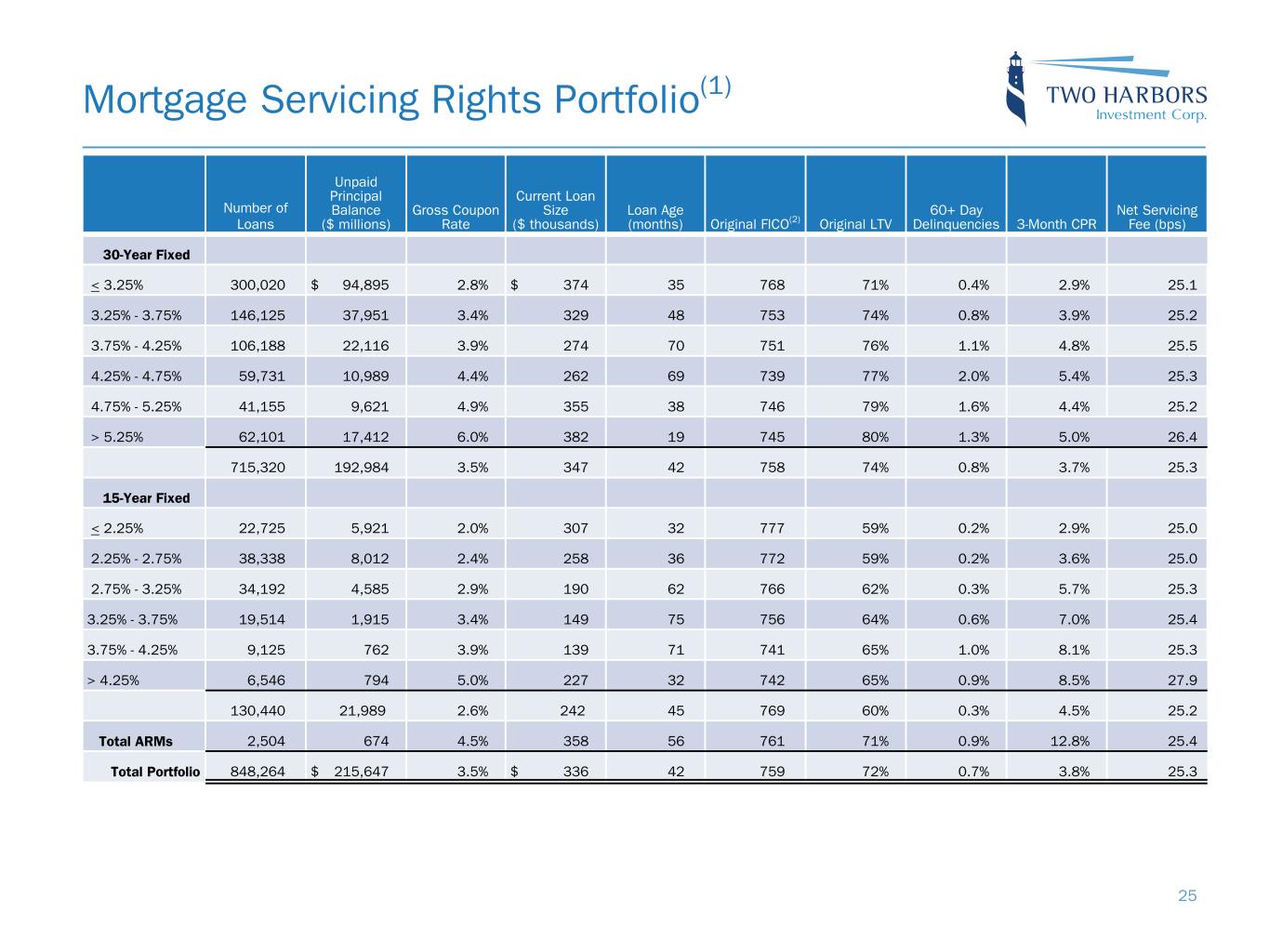 Mortgage Servicing Rights Portfolio(1) Number of Loans Unpaid Principal Balance ($ millions) Gross Coupon Rate Current Loan Size ($ thousands) Loan Age (months) Original FICO(2) Original LTV 60+ Day Delinquencies 3-Month CPR Net Servicing Fee (bps) 30-Year Fixed < 3.25% 300,020 $ 94,895 2.8% $ 374 35 768 71% 0.4% 2.9% 25.1 3.25% - 3.75% 146,125 37,951 3.4% 329 48 753 74% 0.8% 3.9% 25.2 3.75% - 4.25% 106,188 22,116 3.9 % 274 70 751 76 % 1.1 % 4.8 % 25.5 4.25% - 4.75% 59,731 10,989 4.4 % 262 69 739 77 % 2.0 % 5.4 % 25.3 4.75% - 5.25% 41,155 9,621 4.9 % 355 38 746 79 % 1.6 % 4.4 % 25.2 > 5.25% 62,101 17,412 6.0 % 382 19 745 80 % 1.3 % 5.0 % 26.4 715,320 192,984 3.5 % 347 42 758 74 % 0.8 % 3.7 % 25.3 15-Year Fixed < 2.25% 22,725 5,921 2.0 % 307 32 777 59 % 0.2 % 2.9 % 25.0 2.25% - 2.75% 38,338 8,012 2.4 % 258 36 772 59 % 0.2 % 3.6 % 25.0 2.75% - 3.25% 34,192 4,585 2.9 % 190 62 766 62 % 0.3 % 5.7 % 25.3 3.25% - 3.75% 19,514 1,915 3.4 % 149 75 756 64 % 0.6 % 7.0 % 25.4 3.75% - 4.25% 9,125 762 3.9 % 139 71 741 65 % 1.0 % 8.1 % 25.3 > 4.25% 6,546 794 5.0 % 227 32 742 65 % 0.9 % 8.5 % 27.9 130,440 21,989 2.6 % 242 45 769 60 % 0.3 % 4.5 % 25.2 Total ARMs 2,504 674 4.5 % 358 56 761 71 % 0.9 % 12.8 % 25.4 Total Portfolio 848,264 $ 215,647 3.5 % $ 336 42 759 72 % 0.7 % 3.8 % 25.3 25