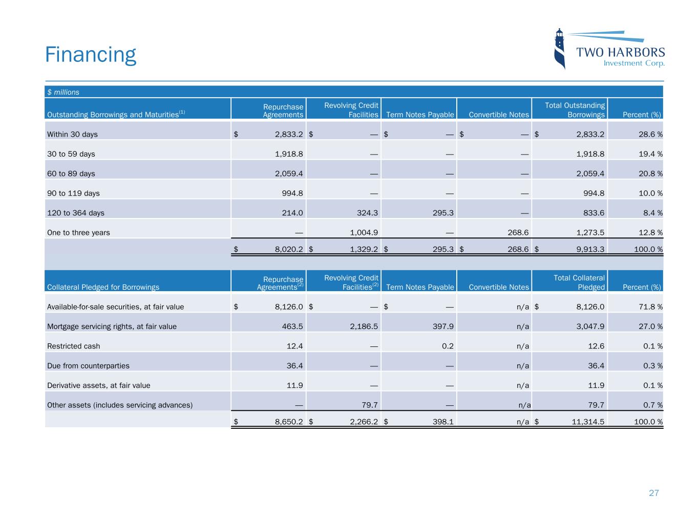 Financing $ millions Outstanding Borrowings and Maturities(1) Repurchase Agreements Revolving Credit Facilities Term Notes Payable Convertible Notes Total Outstanding Borrowings Percent (%) Within 30 days $ 2,833.2 $ — $ — $ — $ 2,833.2 28.6 % 30 to 59 days 1,918.8 — — — 1,918.8 19.4 % 60 to 89 days 2,059.4 — — — 2,059.4 20.8 % 90 to 119 days 994.8 — — — 994.8 10.0 % 120 to 364 days 214.0 324.3 295.3 — 833.6 8.4 % One to three years — 1,004.9 — 268.6 1,273.5 12.8 % $ 8,020.2 $ 1,329.2 $ 295.3 $ 268.6 $ 9,913.3 100.0 % Collateral Pledged for Borrowings Repurchase Agreements(2) Revolving Credit Facilities(2) Term Notes Payable Convertible Notes Total Collateral Pledged Percent (%) Available-for-sale securities, at fair value $ 8,126.0 $ — $ — n/a $ 8,126.0 71.8 % Mortgage servicing rights, at fair value 463.5 2,186.5 397.9 n/a 3,047.9 27.0 % Restricted cash 12.4 — 0.2 n/a 12.6 0.1 % Due from counterparties 36.4 — — n/a 36.4 0.3 % Derivative assets, at fair value 11.9 — — n/a 11.9 0.1 % Other assets (includes servicing advances) — 79.7 — n/a 79.7 0.7 % $ 8,650.2 $ 2,266.2 $ 398.1 n/a $ 11,314.5 100.0 % 27