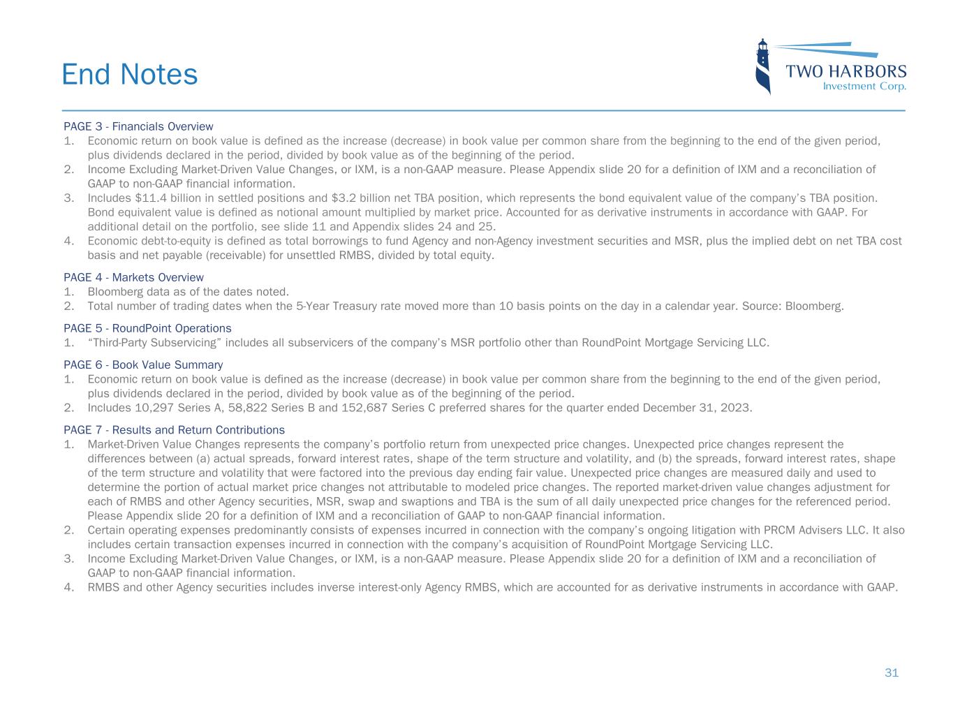 PAGE 3 - Financials Overview 1. Economic return on book value is defined as the increase (decrease) in book value per common share from the beginning to the end of the given period, plus dividends declared in the period, divided by book value as of the beginning of the period. 2. Income Excluding Market-Driven Value Changes, or IXM, is a non-GAAP measure. Please Appendix slide 20 for a definition of IXM and a reconciliation of GAAP to non-GAAP financial information. 3. Includes $11.4 billion in settled positions and $3.2 billion net TBA position, which represents the bond equivalent value of the company’s TBA position. Bond equivalent value is defined as notional amount multiplied by market price. Accounted for as derivative instruments in accordance with GAAP. For additional detail on the portfolio, see slide 11 and Appendix slides 24 and 25. 4. Economic debt-to-equity is defined as total borrowings to fund Agency and non-Agency investment securities and MSR, plus the implied debt on net TBA cost basis and net payable (receivable) for unsettled RMBS, divided by total equity. PAGE 4 - Markets Overview 1. Bloomberg data as of the dates noted. 2. Total number of trading dates when the 5-Year Treasury rate moved more than 10 basis points on the day in a calendar year. Source: Bloomberg. PAGE 5 - RoundPoint Operations 1. “Third-Party Subservicing” includes all subservicers of the company’s MSR portfolio other than RoundPoint Mortgage Servicing LLC. PAGE 6 - Book Value Summary 1. Economic return on book value is defined as the increase (decrease) in book value per common share from the beginning to the end of the given period, plus dividends declared in the period, divided by book value as of the beginning of the period. 2. Includes 10,297 Series A, 58,822 Series B and 152,687 Series C preferred shares for the quarter ended December 31, 2023. PAGE 7 - Results and Return Contributions 1. Market-Driven Value Changes represents the company’s portfolio return from unexpected price changes. Unexpected price changes represent the differences between (a) actual spreads, forward interest rates, shape of the term structure and volatility, and (b) the spreads, forward interest rates, shape of the term structure and volatility that were factored into the previous day ending fair value. Unexpected price changes are measured daily and used to determine the portion of actual market price changes not attributable to modeled price changes. The reported market-driven value changes adjustment for each of RMBS and other Agency securities, MSR, swap and swaptions and TBA is the sum of all daily unexpected price changes for the referenced period. Please Appendix slide 20 for a definition of IXM and a reconciliation of GAAP to non-GAAP financial information. 2. Certain operating expenses predominantly consists of expenses incurred in connection with the company’s ongoing litigation with PRCM Advisers LLC. It also includes certain transaction expenses incurred in connection with the company’s acquisition of RoundPoint Mortgage Servicing LLC. 3. Income Excluding Market-Driven Value Changes, or IXM, is a non-GAAP measure. Please Appendix slide 20 for a definition of IXM and a reconciliation of GAAP to non-GAAP financial information. 4. RMBS and other Agency securities includes inverse interest-only Agency RMBS, which are accounted for as derivative instruments in accordance with GAAP. End Notes 31
