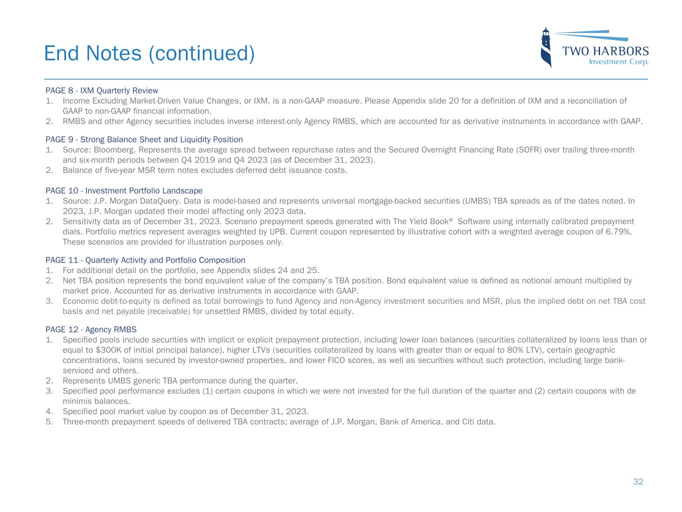 PAGE 8 - IXM Quarterly Review 1. Income Excluding Market-Driven Value Changes, or IXM, is a non-GAAP measure. Please Appendix slide 20 for a definition of IXM and a reconciliation of GAAP to non-GAAP financial information. 2. RMBS and other Agency securities includes inverse interest-only Agency RMBS, which are accounted for as derivative instruments in accordance with GAAP. PAGE 9 - Strong Balance Sheet and Liquidity Position 1. Source: Bloomberg. Represents the average spread between repurchase rates and the Secured Overnight Financing Rate (SOFR) over trailing three-month and six-month periods between Q4 2019 and Q4 2023 (as of December 31, 2023). 2. Balance of five-year MSR term notes excludes deferred debt issuance costs. PAGE 10 - Investment Portfolio Landscape 1. Source: J.P. Morgan DataQuery. Data is model-based and represents universal mortgage-backed securities (UMBS) TBA spreads as of the dates noted. In 2023, J.P. Morgan updated their model affecting only 2023 data. 2. Sensitivity data as of December 31, 2023. Scenario prepayment speeds generated with The Yield Book® Software using internally calibrated prepayment dials. Portfolio metrics represent averages weighted by UPB. Current coupon represented by illustrative cohort with a weighted average coupon of 6.79%. These scenarios are provided for illustration purposes only. PAGE 11 - Quarterly Activity and Portfolio Composition 1. For additional detail on the portfolio, see Appendix slides 24 and 25. 2. Net TBA position represents the bond equivalent value of the company’s TBA position. Bond equivalent value is defined as notional amount multiplied by market price. Accounted for as derivative instruments in accordance with GAAP. 3. Economic debt-to-equity is defined as total borrowings to fund Agency and non-Agency investment securities and MSR, plus the implied debt on net TBA cost basis and net payable (receivable) for unsettled RMBS, divided by total equity. PAGE 12 - Agency RMBS 1. Specified pools include securities with implicit or explicit prepayment protection, including lower loan balances (securities collateralized by loans less than or equal to $300K of initial principal balance), higher LTVs (securities collateralized by loans with greater than or equal to 80% LTV), certain geographic concentrations, loans secured by investor-owned properties, and lower FICO scores, as well as securities without such protection, including large bank- serviced and others. 2. Represents UMBS generic TBA performance during the quarter. 3. Specified pool performance excludes (1) certain coupons in which we were not invested for the full duration of the quarter and (2) certain coupons with de minimis balances. 4. Specified pool market value by coupon as of December 31, 2023. 5. Three-month prepayment speeds of delivered TBA contracts; average of J.P. Morgan, Bank of America, and Citi data. End Notes (continued) 32
