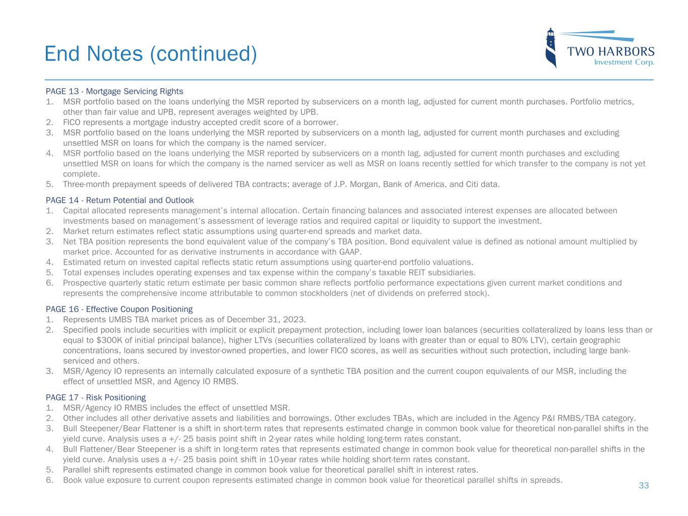 End Notes (continued) PAGE 13 - Mortgage Servicing Rights 1. MSR portfolio based on the loans underlying the MSR reported by subservicers on a month lag, adjusted for current month purchases. Portfolio metrics, other than fair value and UPB, represent averages weighted by UPB. 2. FICO represents a mortgage industry accepted credit score of a borrower. 3. MSR portfolio based on the loans underlying the MSR reported by subservicers on a month lag, adjusted for current month purchases and excluding unsettled MSR on loans for which the company is the named servicer. 4. MSR portfolio based on the loans underlying the MSR reported by subservicers on a month lag, adjusted for current month purchases and excluding unsettled MSR on loans for which the company is the named servicer as well as MSR on loans recently settled for which transfer to the company is not yet complete. 5. Three-month prepayment speeds of delivered TBA contracts; average of J.P. Morgan, Bank of America, and Citi data. PAGE 14 - Return Potential and Outlook 1. Capital allocated represents management’s internal allocation. Certain financing balances and associated interest expenses are allocated between investments based on management’s assessment of leverage ratios and required capital or liquidity to support the investment. 2. Market return estimates reflect static assumptions using quarter-end spreads and market data. 3. Net TBA position represents the bond equivalent value of the company’s TBA position. Bond equivalent value is defined as notional amount multiplied by market price. Accounted for as derivative instruments in accordance with GAAP. 4. Estimated return on invested capital reflects static return assumptions using quarter-end portfolio valuations. 5. Total expenses includes operating expenses and tax expense within the company’s taxable REIT subsidiaries. 6. Prospective quarterly static return estimate per basic common share reflects portfolio performance expectations given current market conditions and represents the comprehensive income attributable to common stockholders (net of dividends on preferred stock). PAGE 16 - Effective Coupon Positioning 1. Represents UMBS TBA market prices as of December 31, 2023. 2. Specified pools include securities with implicit or explicit prepayment protection, including lower loan balances (securities collateralized by loans less than or equal to $300K of initial principal balance), higher LTVs (securities collateralized by loans with greater than or equal to 80% LTV), certain geographic concentrations, loans secured by investor-owned properties, and lower FICO scores, as well as securities without such protection, including large bank- serviced and others. 3. MSR/Agency IO represents an internally calculated exposure of a synthetic TBA position and the current coupon equivalents of our MSR, including the effect of unsettled MSR, and Agency IO RMBS. PAGE 17 - Risk Positioning 1. MSR/Agency IO RMBS includes the effect of unsettled MSR. 2. Other includes all other derivative assets and liabilities and borrowings. Other excludes TBAs, which are included in the Agency P&I RMBS/TBA category. 3. Bull Steepener/Bear Flattener is a shift in short-term rates that represents estimated change in common book value for theoretical non-parallel shifts in the yield curve. Analysis uses a +/- 25 basis point shift in 2-year rates while holding long-term rates constant. 4. Bull Flattener/Bear Steepener is a shift in long-term rates that represents estimated change in common book value for theoretical non-parallel shifts in the yield curve. Analysis uses a +/- 25 basis point shift in 10-year rates while holding short-term rates constant. 5. Parallel shift represents estimated change in common book value for theoretical parallel shift in interest rates. 6. Book value exposure to current coupon represents estimated change in common book value for theoretical parallel shifts in spreads. 33